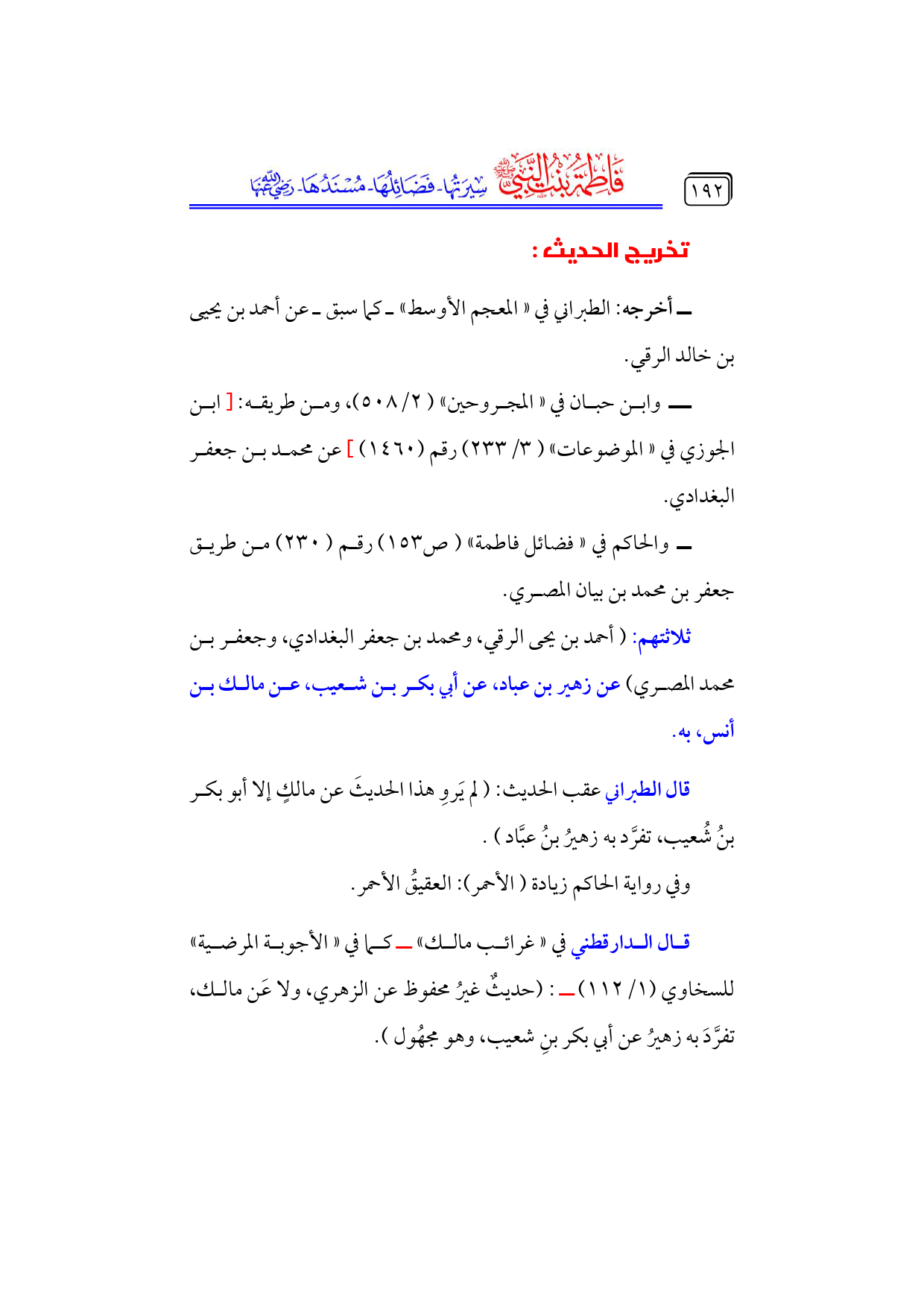 ــ والحاكم في «فضائل فاطمة» (ص ١٥٣) رقم (٢٣٠) من طريق جعفر بن محمد بن بيان المصري.