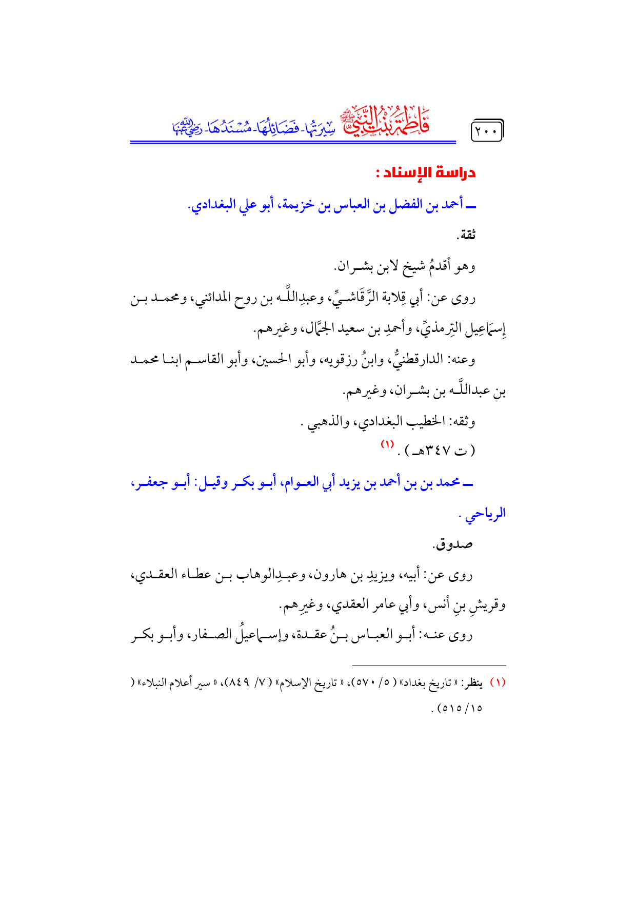 (¬١) ينظر: «تاريخ بغداد» (٥/ ٥٧٠)، «تاريخ الإسلام» (٧/ ٨٤٩)، «سير أعلام النبلاء» (١٥/ ٥١٥).