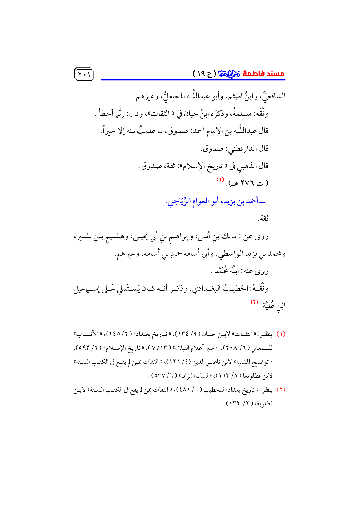 (¬١) ينظر: «الثقات» لابن حبان (٩/ ١٣٤)، «تاريخ بغداد» (٢/ ٢٤٥)، «الأنساب» للسمعاني (٦/ ٢٠٨)، «سير أعلام النبلاء» (١٣/ ٧)، «تاريخ الإسلام» (٦/ ٥٩٣)، «توضيح المشتبه» لابن ناصر الدين (٤/ ١٢١)، «الثقات ممن لم يقع في الكتب الستة» لابن قطلوبغا (٨/ ١٦٣)، «لسان الميزان» (٦/ ٥٣٧).