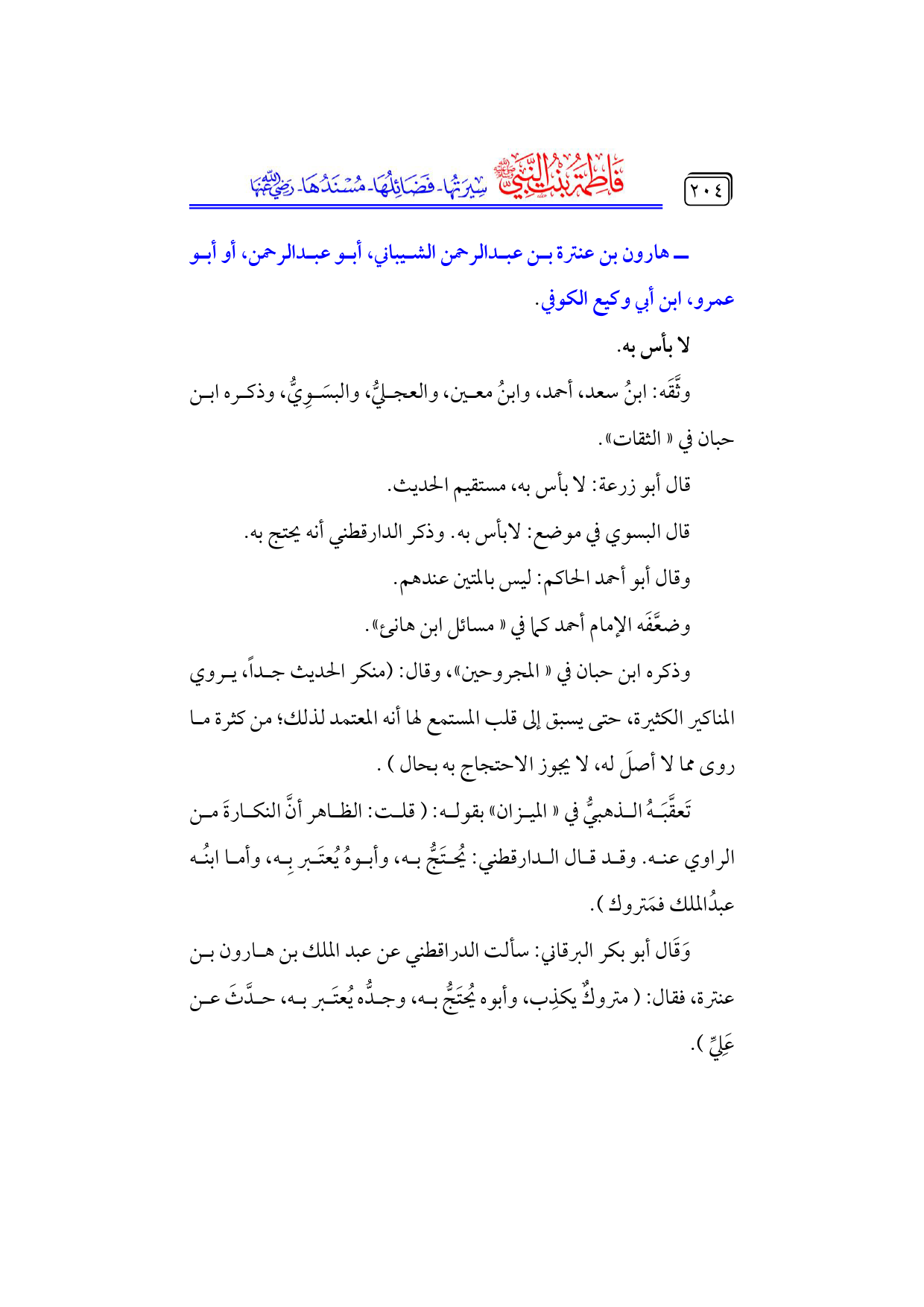 وَقَال أبو بكر البرقاني: سألت الدراقطني عن عبد الملك بن هارون بن عنترة، فقال: (متروكٌ يكذِب، وأبوه يُحتَجُّ به، وجدُّه يُعتَبر به، حدَّثَ عن ... عَلِيِّ).