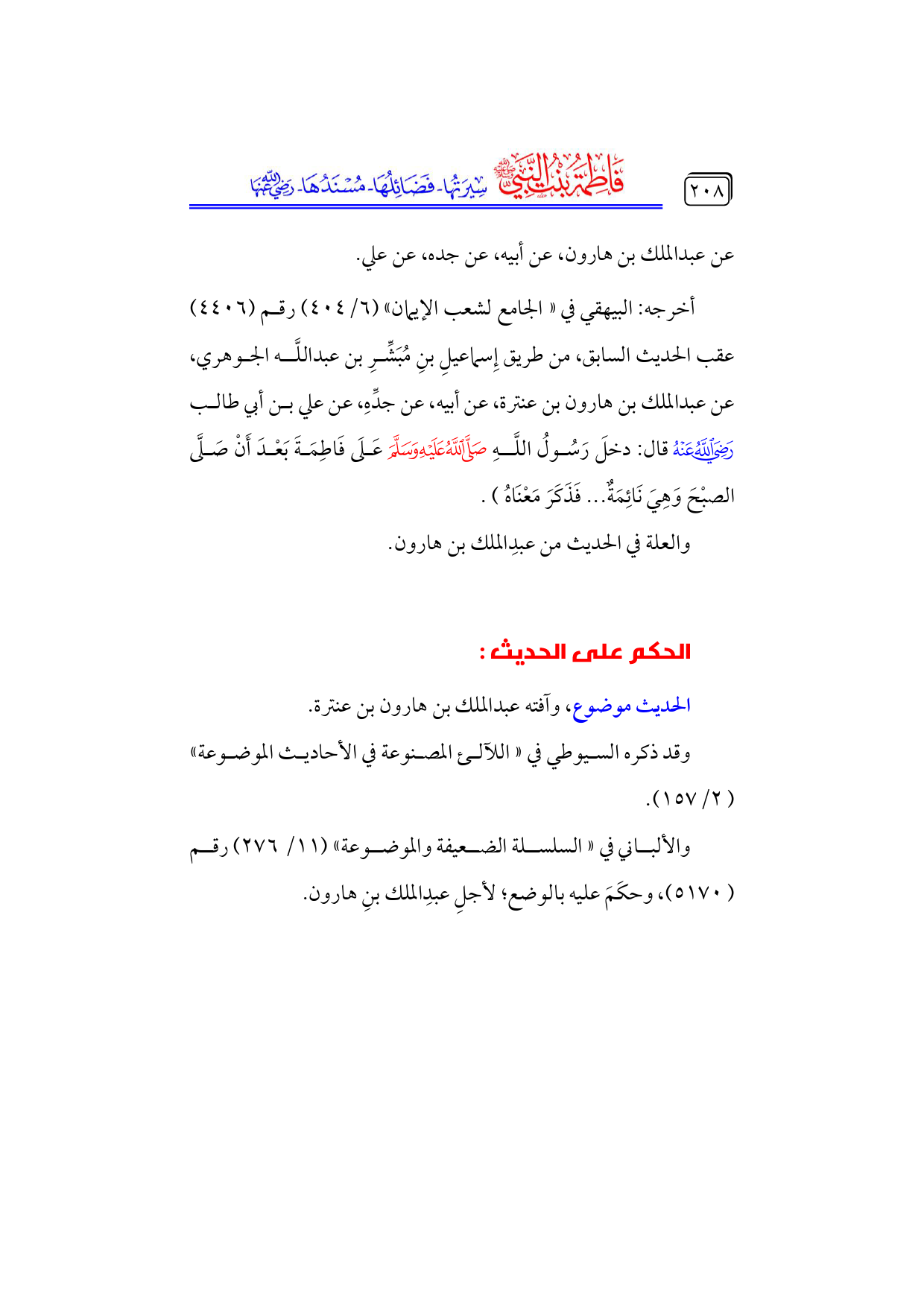 أخرجه: البيهقي في «الجامع لشعب الإيمان» (٦/ ٤٠٤) رقم (٤٤٠٦) عقب الحديث السابق، من طريق إِسماعيلِ بنِ مُبَشِّرِ بن عبداللَّه الجوهري، عن عبدالملك بن هارون بن عنترة، عن أبيه، عن جدِّهِ، عن علي بن أبي طالب - رضي الله عنه - قال: دخلَ رَسُولُ اللَّهِ - صلى الله عليه وسلم - عَلَى فَاطِمَةَ بَعْدَ أَنْ صَلَّى الصبْحَ وَهِيَ نَائِمَةٌ ... فَذَكَرَ مَعْنَاهُ).
