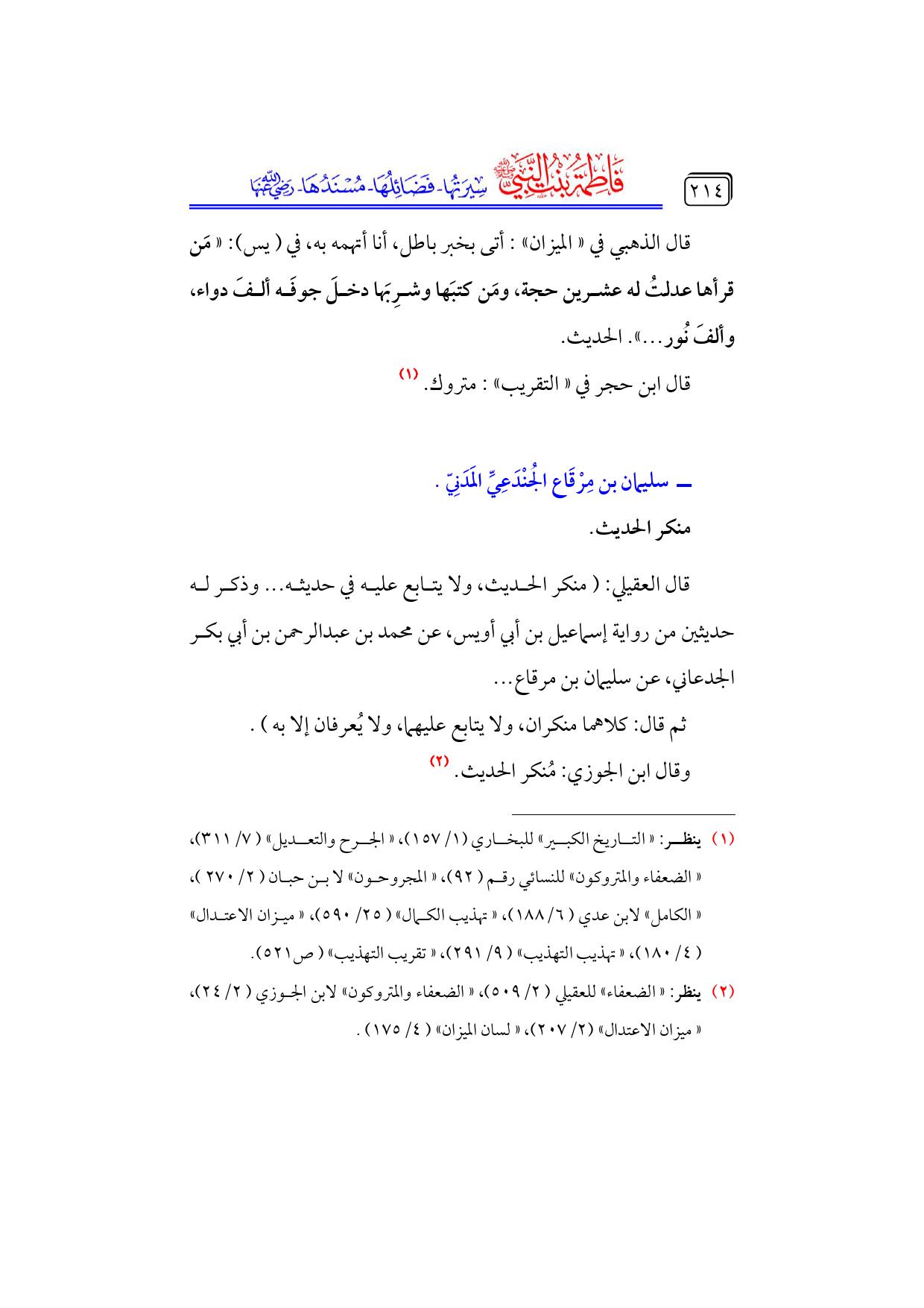 (¬٢) ينظر: «الضعفاء» للعقيلي (٢/ ٥٠٩)، «الضعفاء والمتروكون» لابن الجوزي (٢/ ٢٤)، «ميزان الاعتدال» (٢/ ٢٠٧)، «لسان الميزان» (٤/ ١٧٥).