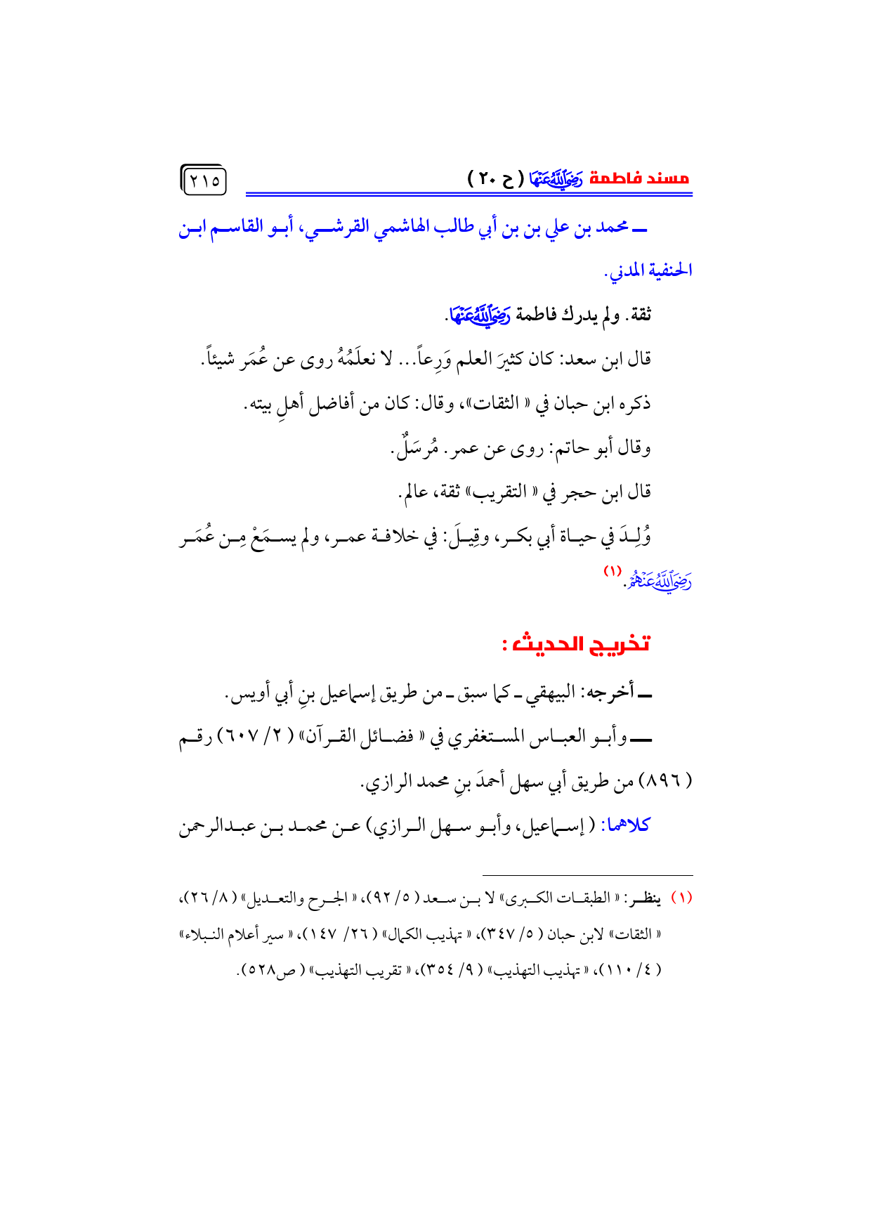 كتاب فاطمة بنت النبي - صلى الله عليه وسلم - سيرتها، فضائلها، مسندها - رضي الله عنها - (اسم الجزء: 6)