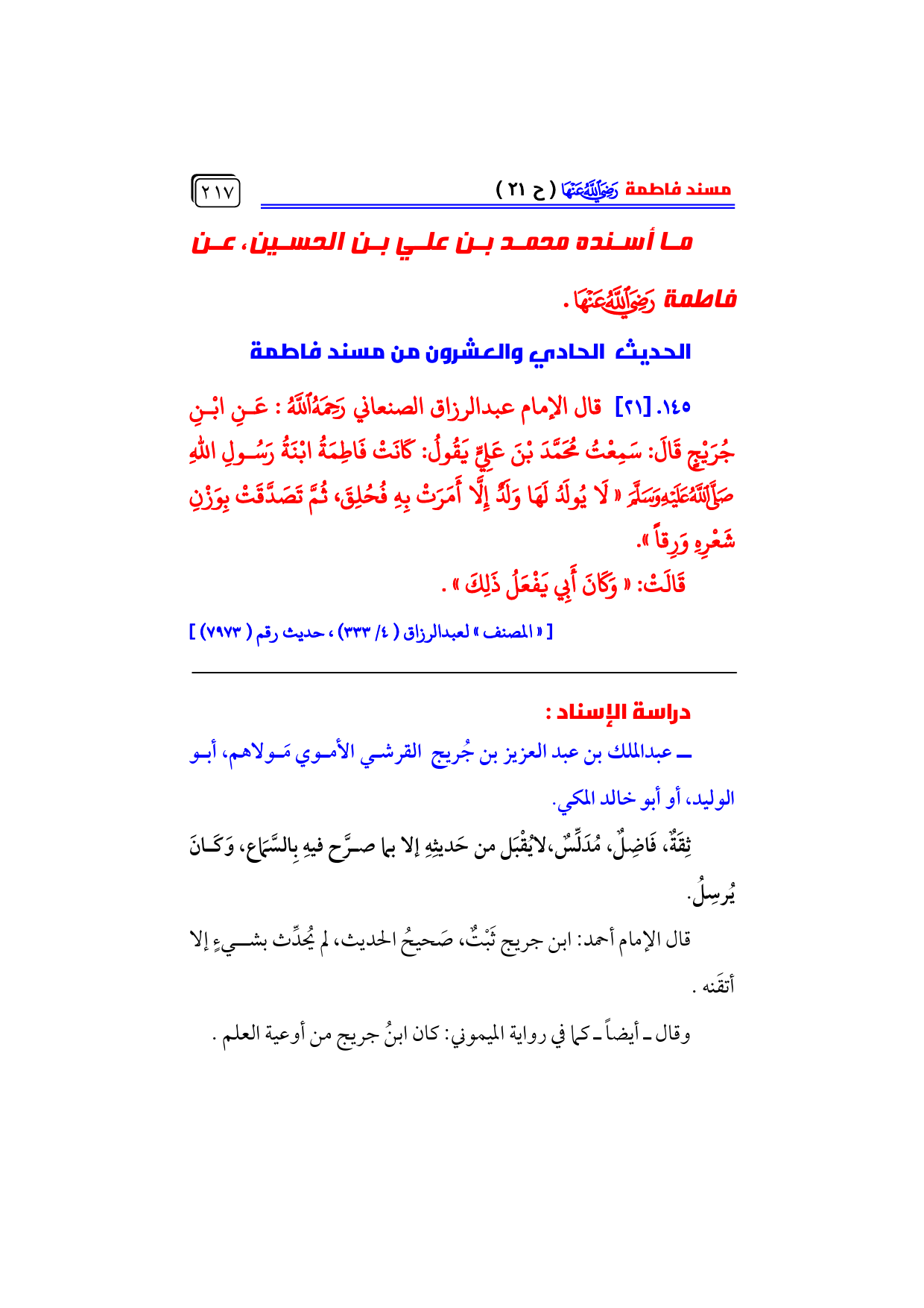 الحديث الحادي والعشرون من مسند فاطمة