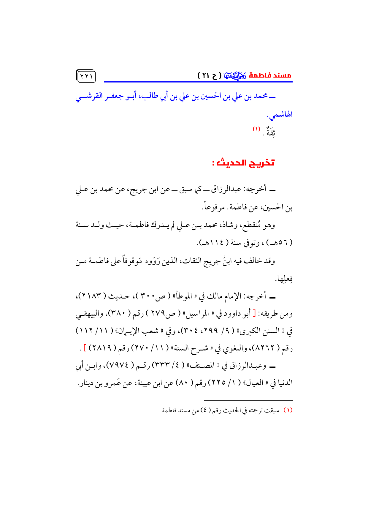 ــ أخرجه: عبدالرزاق ــ كما سبق ــ عن ابن جريج، عن محمد بن علي بن الحسين، عن فاطمة. مرفوعاً.