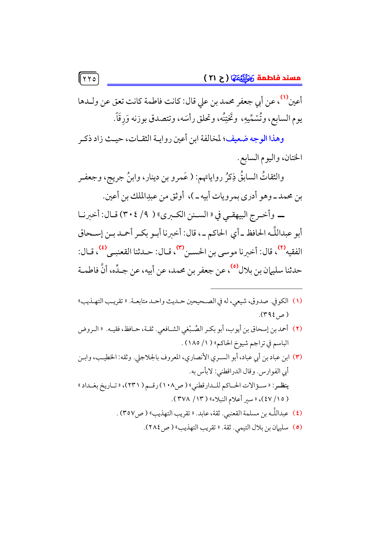 أبي سليمان (¬١)، عن عبدالملك بن أعين (¬٢)، عن أبي جعفر محمد بن علي قال: كانت فاطمة كانت تعق عن ولدها يوم السابع، وتُسّمِّيهِ، وتَختِنُه، وتحلق رأسَه، وتتصدق بوزنه وَرِقَاً.