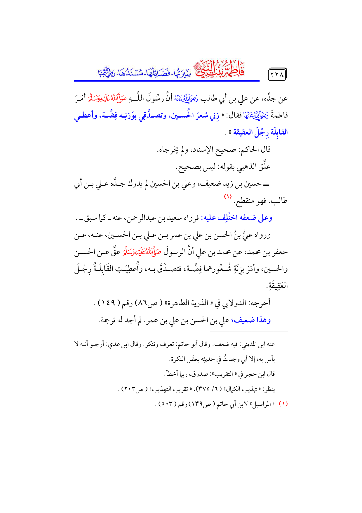 ــ حسين بن زيد ضعيف، وعلي بن الحسين لم يدرك جدَّه علي بن أبي طالب. فهو منقطع. (¬١)