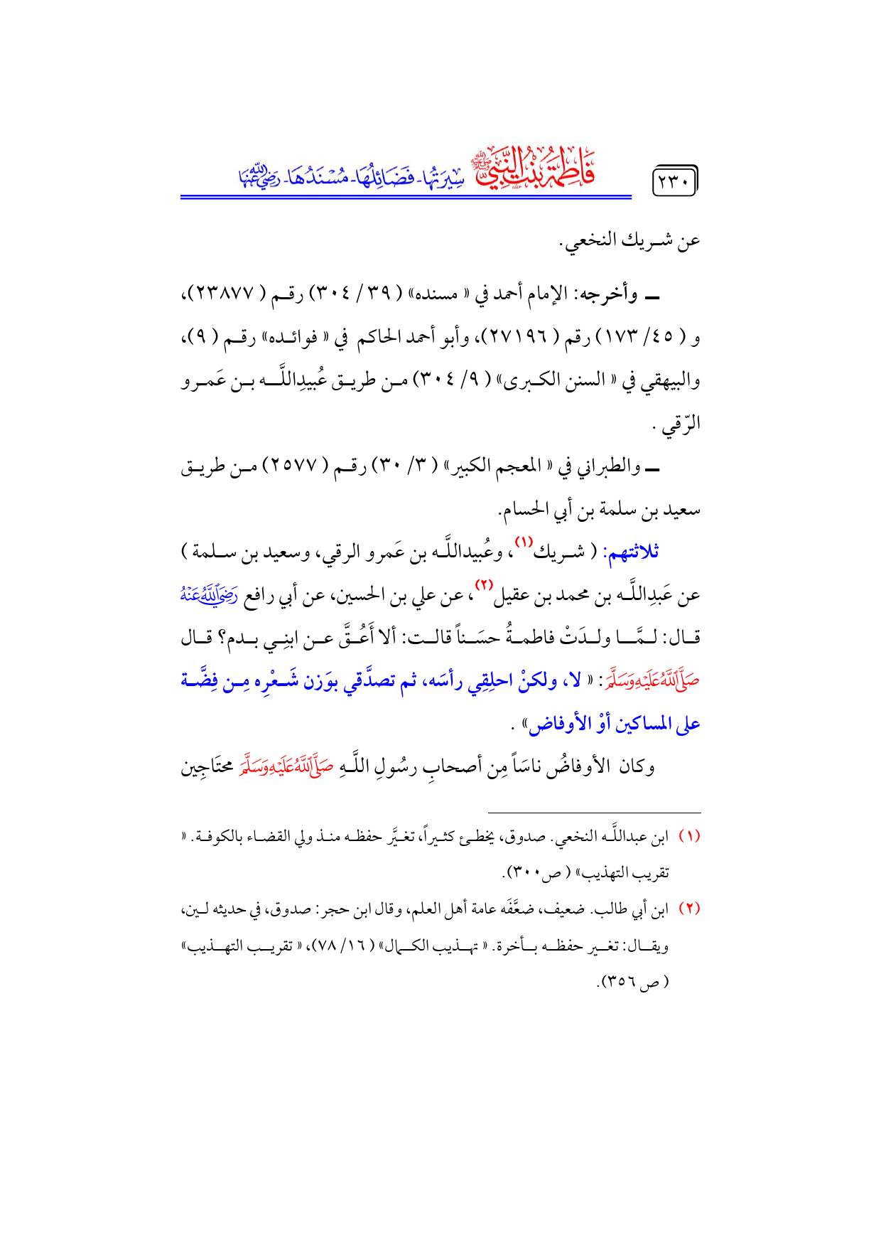 ثلاثتهم: (شريك (¬١)، وعُبيداللَّه بن عَمرو الرقي، وسعيد بن سلمة) عن عَبدِاللَّه بن محمد بن عقيل (¬٢)، عن علي بن الحسين، عن أبي رافع - رضي الله عنه - قال: لمَّا ولدَتْ فاطمةُ حسَناً قالت: ألا أَعُقَّ عن ابنِي بدم؟ قال - صلى الله عليه وسلم -: «لا، ولكنْ احلِقِي رأسَه، ثم تصدَّقي بوَزن شَعْرِه مِن فِضَّة على المساكين أوْ الأوفاض».