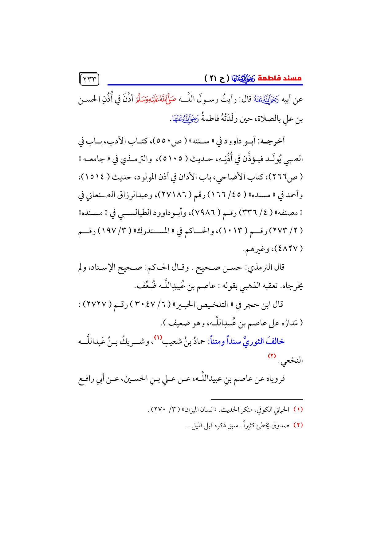 أخرجه: أبو داوود في «سننه» (ص ٥٥٠)، كتاب الأدب، باب في الصبي يُولَد فيؤذَّن في أُذُنِه، حديث (٥١٠٥)، والترمذي في «جامعه» ... (ص ٢٦٦)، كتاب الأضاحي، باب الأذان في أذن المولود، حديث (١٥١٤)، وأحمد في «مسنده» (٤٥/ ١٦٦) رقم (٢٧١٨٦)، وعبدالرزاق الصنعاني في «مصنفه» (٤/ ٣٣٦) رقم (٧٩٨٦)، وأبوداوود الطيالسي في «مسنده» ... (٢/ ٢٧٣) رقم (١٠١٣)، والحاكم في «المستدرك» (٣/ ١٩٧) رقم ... (٤٨٢٧)، وغيرهم.