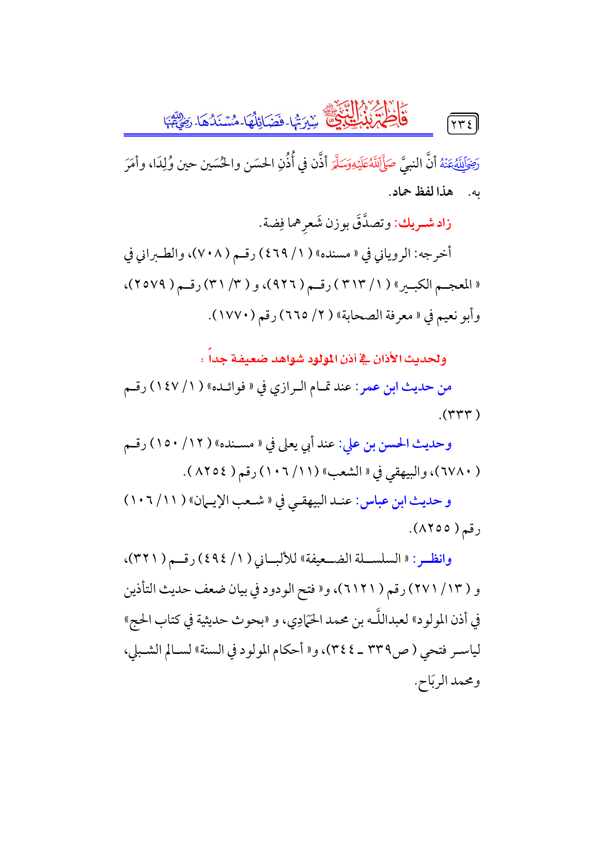 وانظر: «السلسلة الضعيفة» للألباني (١/ ٤٩٤) رقم (٣٢١)، ... و (١٣/ ٢٧١) رقم (٦١٢١)، و «فتح الودود في بيان ضعف حديث التأذين في أذن المولود» لعبداللَّه بن محمد الحَمَادِي، و «بحوث حديثية في كتاب الحج» لياسر فتحي (ص ٣٣٩ ـ ٣٤٤)، و «أحكام المولود في السنة» لسالم الشبلي، ومحمد الربَاح.