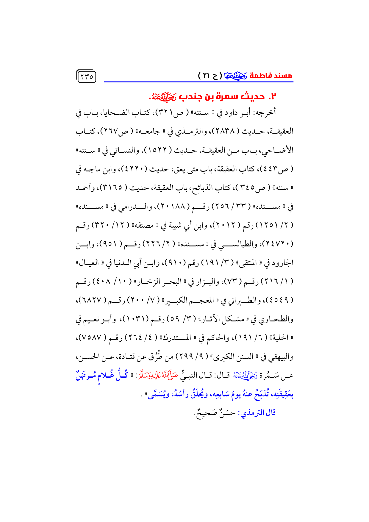 أخرجه: أبو داود في «سننه» (ص ٣٢١)، كتاب الضحايا، باب في العقيقة، حديث (٢٨٣٨)، والترمذي في «جامعه» (ص ٢٦٧)، كتاب الأضاحي، باب من العقيقة، حديث (١٥٢٢)، والنسائي في «سننه» ... (ص ٤٤٣)، كتاب العقيقة، باب متى يعق، حديث (٤٢٢٠)، وابن ماجه في «سننه» (ص ٣٤٥)، كتاب الذبائح، باب العقيقة، حديث (٣١٦٥)، وأحمد في «مسنده» (٣٣/ ٢٥٦) رقم (٢٠١٨٨)، والدرامي في «مسنده» ... (٢/ ١٢٥١) رقم (٢٠١٢)، وابن أبي شيبة في «مصنفه» (١٢/ ٣٢٠) رقم (٢٤٧٢٠)، والطيالسي في «مسنده» (٢/ ٢٢٦) رقم (٩٥١)، وابن الجارود في «المنتقى» (٣/ ١٩١) رقم (٩١٠)، وابن أبي الدنيا في «العيال» ... (١/ ٢١٦) رقم (٧٣)، والبزار في «البحر الزخار» (١٠/ ٤٠٨) رقم ... (٤٥٤٩)، والطبراني في «المعجم الكبير» (٧/ ٢٠٠) رقم (٦٨٢٧)، والطحاوي في «مشكل الآثار» (٣/ ٥٩) رقم (١٠٣١)، وأبو نعيم في ... «الحلية» (٦/ ١٩١)، والحاكم في «المستدرك» (٤/ ٢٦٤) رقم (٧٥٨٧)، والبيهقي في «السنن الكبرى» (٩/ ٢٩٩) من طُرُق عن قتادة، عن الحسن، عن سَمُرة - رضي الله عنه - قال: قال النبيُّ - صلى الله عليه وسلم -: «كُلُّ غُلامٍ مُرتَهَنٌ بعَقِيقَتِه، تُذبَحُ عنهُ يومَ سَابعِه، ويُحلَقُ رأسُهُ، ويُسَمَّى».