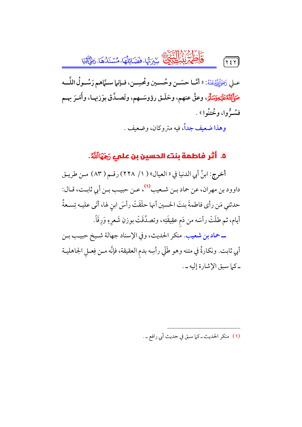 أخرج: ابنُ أبي الدنيا في «العيال» (١/ ٢٢٨) رقم (٨٣) من طريق داوود بن مهران، عن حماد بن شعيب (¬١)، عن حبيب بن أبي ثابت، قال: حدثني مَن رأى فاطمةَ بنتَ الحسين أنها حلَقَتْ رأسَ ابنٍ لها، أتَى عليه تِسعةُ أيام، ثم طلَتْ رأسَه من دَمِ عقِيقَتِه، وتصدَّقَتْ بوزنِ شَعرِهِ وَرِقَاً.