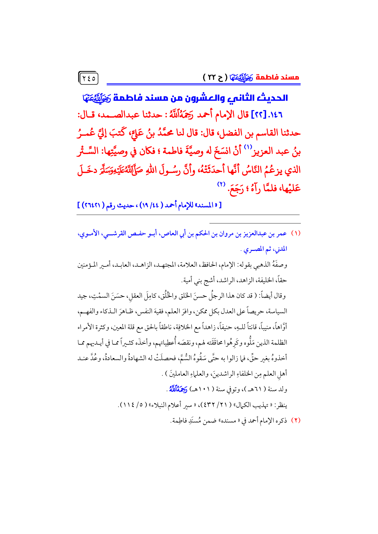 (¬٢) ذكره الإمام أحمد في «مسنده» ضمن مُسنَدِ فاطِمة.