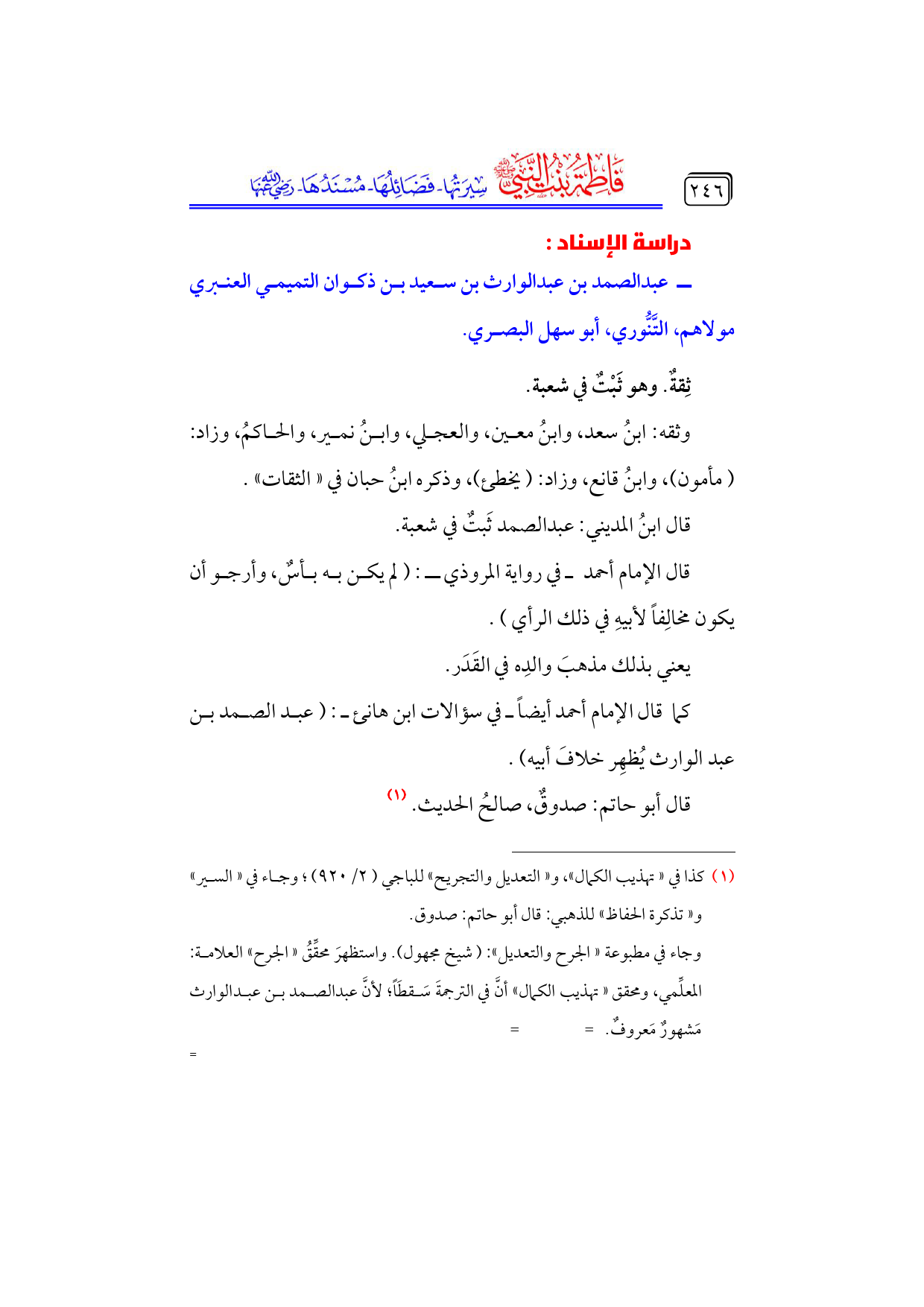 وجاء في مطبوعة «الجرح والتعديل»: (شيخ مجهول). واستظهرَ محقِّقُ «الجرح» العلامة: المعلِّمي، ومحقق «تهذيب الكمال» أنَّ في الترجمةَ سَقطَاً؛ لأنَّ عبدالصمد بن عبدالوارث مَشهورٌ مَعروفٌ. = ... =