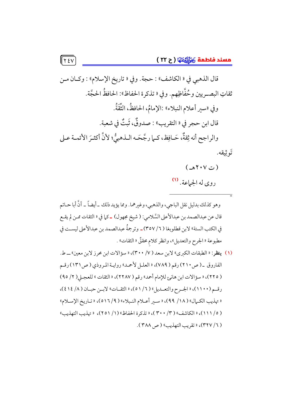(¬١) ينظر: «الطبقات الكبرى» لابن سعد (٧/ ٣٠٠)، «سؤالات ابن محرز لابن معين» ـ ط. الفاروق ـ (ص ٢١٠) رقم (٧٨٩)، «العلل لأحمد» رواية المروذي (ص ١٣١) رقم ... (٢٢٥)، «سؤالات ابن هانئ للإمام أحمد» رقم (٢٢٨٧)، «الثقات» للعجلي (٢/ ٩٥) رقم (١١٠٠)، «الجرح والتعديل» (٦/ ٥١)، «الثقات» لابن حبان (٨/ ٤١٤)، ... «تهذيب الكمال» (١٨/ ٩٩)، «سير أعلام النبلاء» (٩/ ٥١٦)، «تاريخ الإسلام» ... (٥/ ١١١)، «الكاشف» (٣/ ٣٠٠)، «تذكرة الحفاظ» (١/ ٢٥١)، «تهذيب التهذيب» (٦/ ٣٢٧)، «تقريب التهذيب» (ص ٣٨٨).