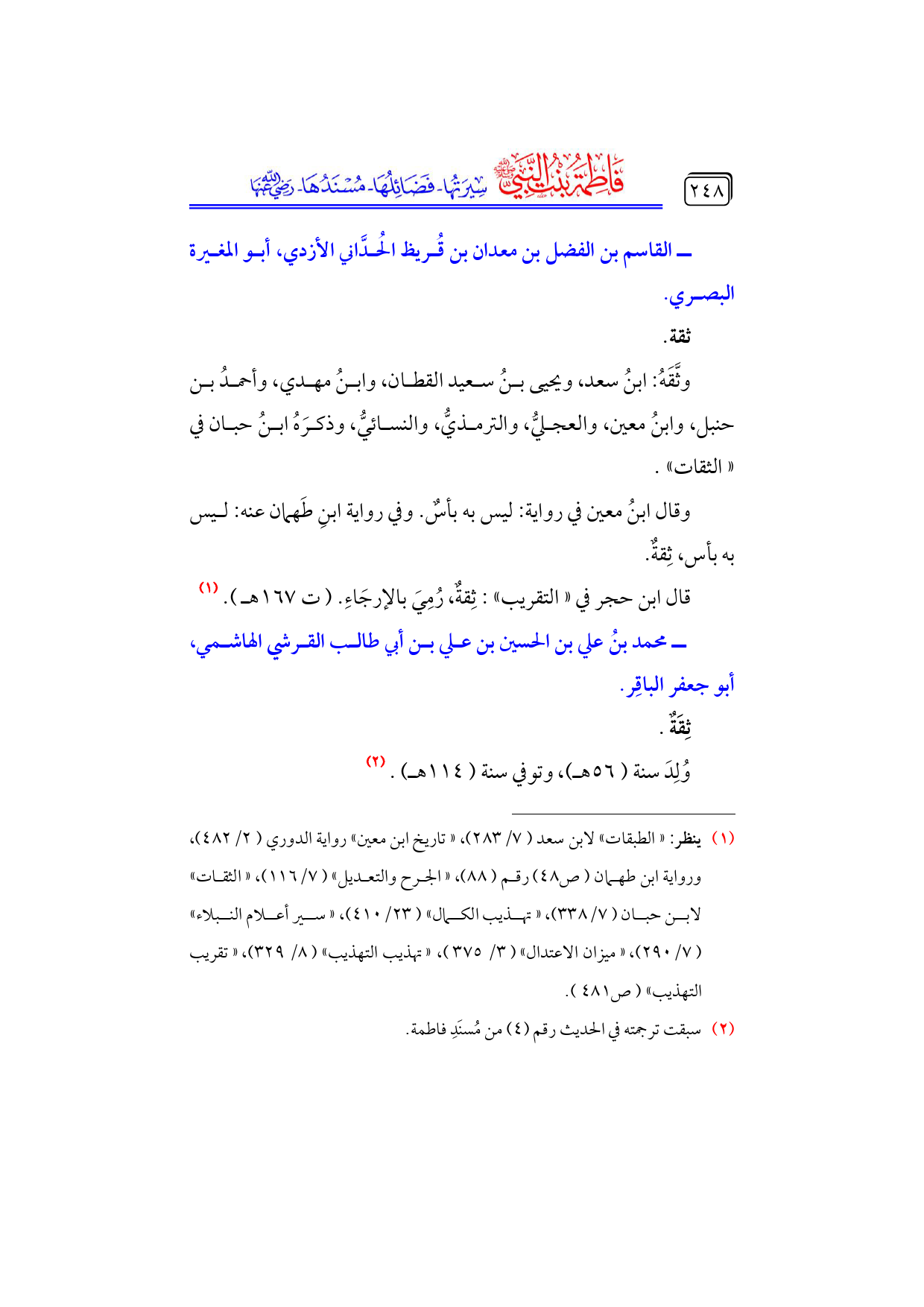 كتاب فاطمة بنت النبي - صلى الله عليه وسلم - سيرتها، فضائلها، مسندها - رضي الله عنها - (اسم الجزء: 6)