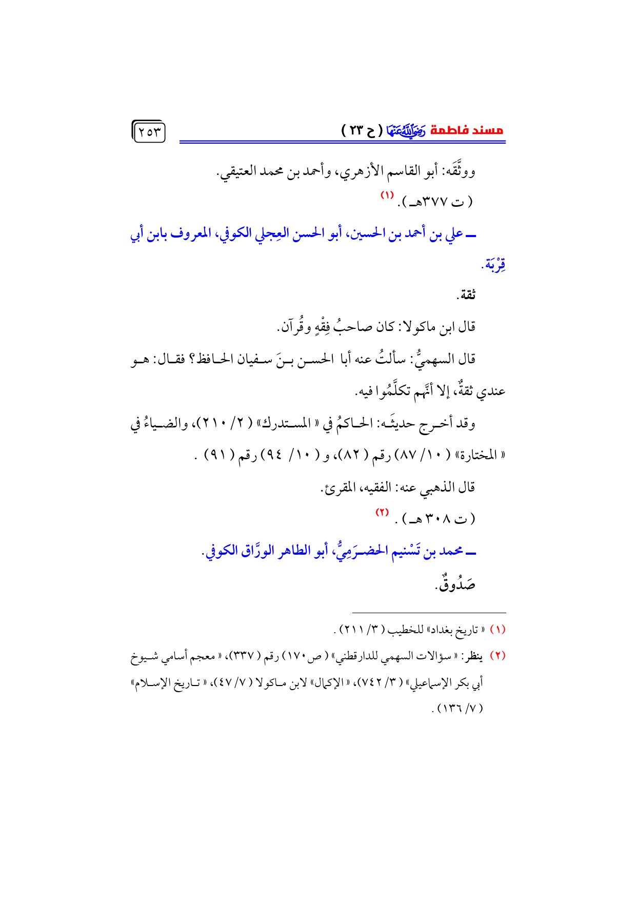 (¬٢) ينظر: «سؤالات السهمي للدارقطني» (ص ١٧٠) رقم (٣٣٧)، «معجم أسامي شيوخ أبي بكر الإسماعيلي» (٣/ ٧٤٢)، «الإكمال» لابن ماكولا (٧/ ٤٧)، «تاريخ الإسلام» ... (٧/ ١٣٦).