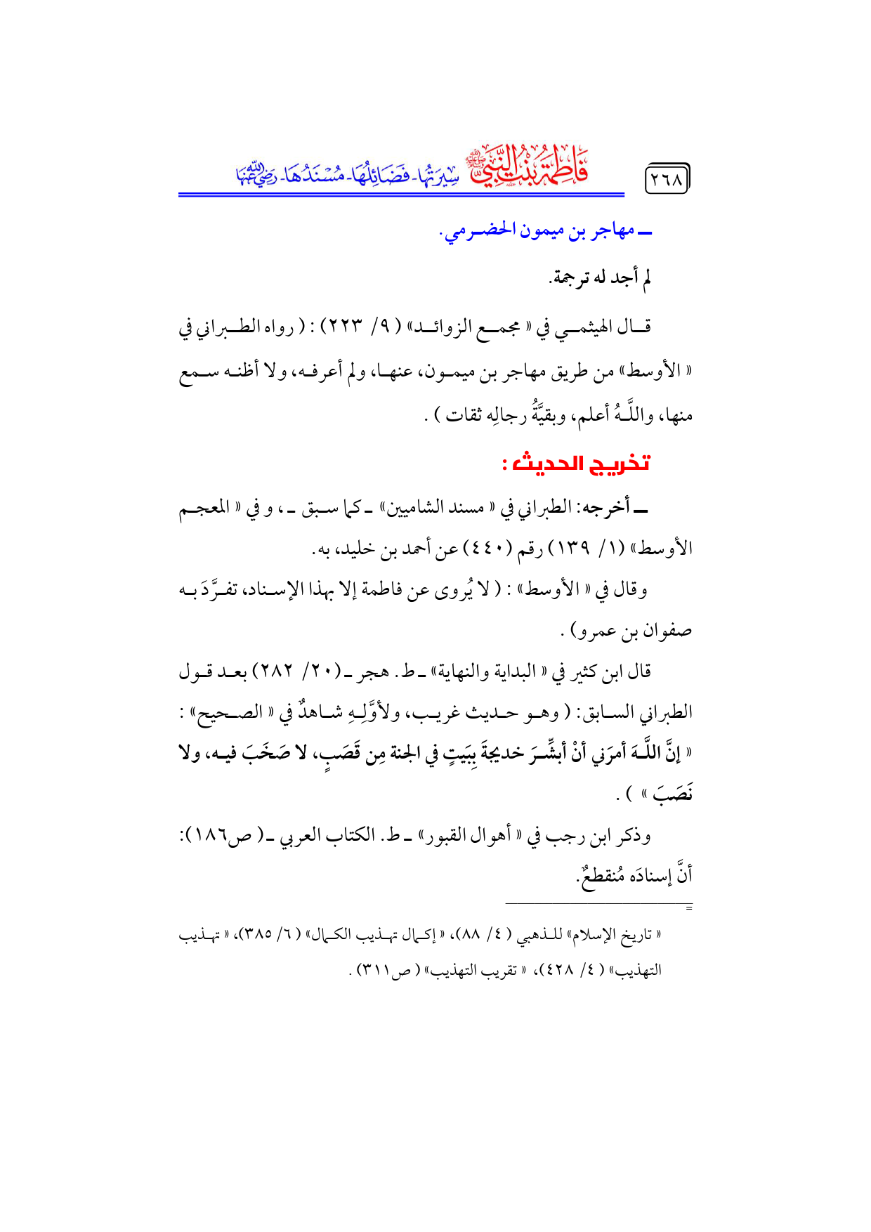قال الهيثمي في «مجمع الزوائد» (٩/ ٢٢٣): (رواه الطبراني في ... «الأوسط» من طريق مهاجر بن ميمون، عنها، ولم أعرفه، ولا أظنه سمع منها، واللَّهُ أعلم، وبقيَّةُ رجالِه ثقات).