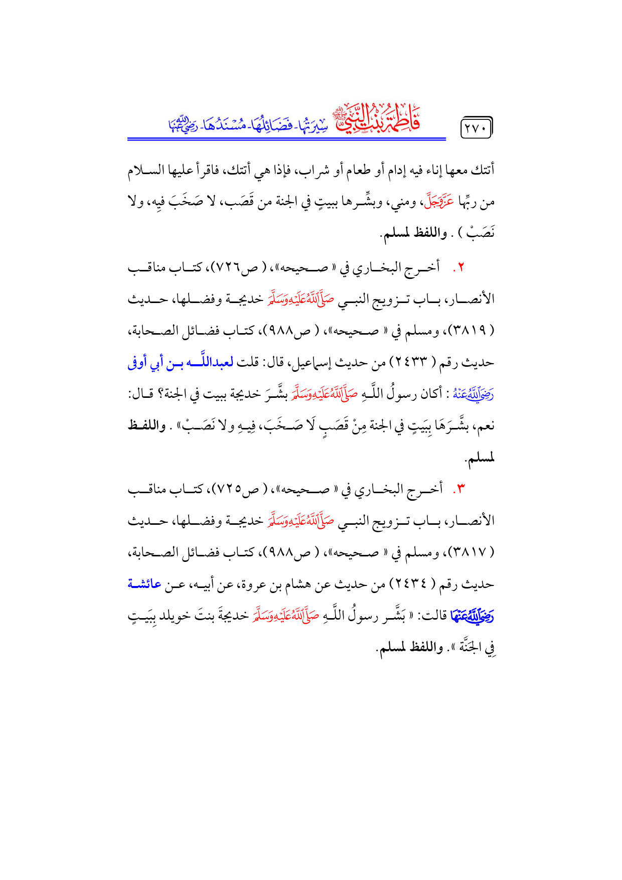 ٢. أخرج البخاري في «صحيحه»، (ص ٧٢٦)، كتاب مناقب الأنصار، باب تزويج النبي - صلى الله عليه وسلم - خديجة وفضلها، حديث ... (٣٨١٩)، ومسلم في «صحيحه»، (ص ٩٨٨)، كتاب فضائل الصحابة، حديث رقم (٢٤٣٣) من حديث إسماعيل، قال: قلت لعبداللَّه بن أبي أوفى - رضي الله عنه -: أكان رسولُ اللَّهِ - صلى الله عليه وسلم - بشَّرَ خديجة ببيت في الجنة؟ قال: نعم، بشَّرَهَا بِبَيتٍ في الجنة مِنْ قَصَبٍ لَا صَخَبَ، فِيهِ ولا نَصَبْ». واللفظ لمسلم.
