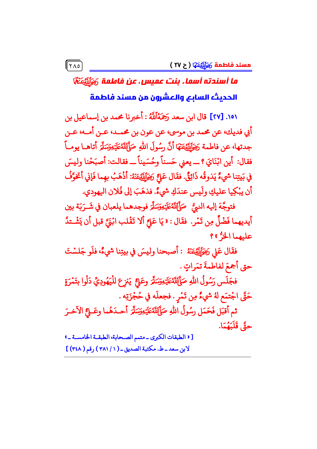 ١٥٠. [٢٧] قال ابن سعد - رحمه الله -: أخبرنا محمد بن إسماعيل بن أبي فديك، عن محمد بن موسى، عن عون بن محمد، عن أمه، عن جدتها، عن فاطمة - رضي الله عنها - أنَّ رسُولَ اللهِ - صلى الله عليه وسلم - أتاها يوماً فقال: أين ابْنَايَ؟ ــ يعني حَسناً وحُسَيناً ــ فقالت: أصبَحْنا وليسَ في بَيتِنا شيءٌ يَذوقُه ذَائِقٌ. فقَال عَليٌّ - رضي الله عنه -: أذْهَبُ بهِما فَإني أتخوَّفُ أن يبْكِيا عليكِ ولَيس عندَكِ شيءٌ. فذهَبَ إلى فُلان اليهودي.