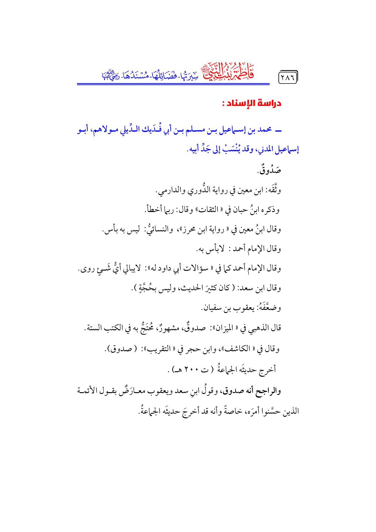 والراجح أنه صدوق، وقولُ ابنِ سعد ويعقوب معارَضٌ بقول الأئمة الذين حسَّنوا أمرَه، خاصةً وأنه قد أخرجَ حديثَه الجماعةُ.