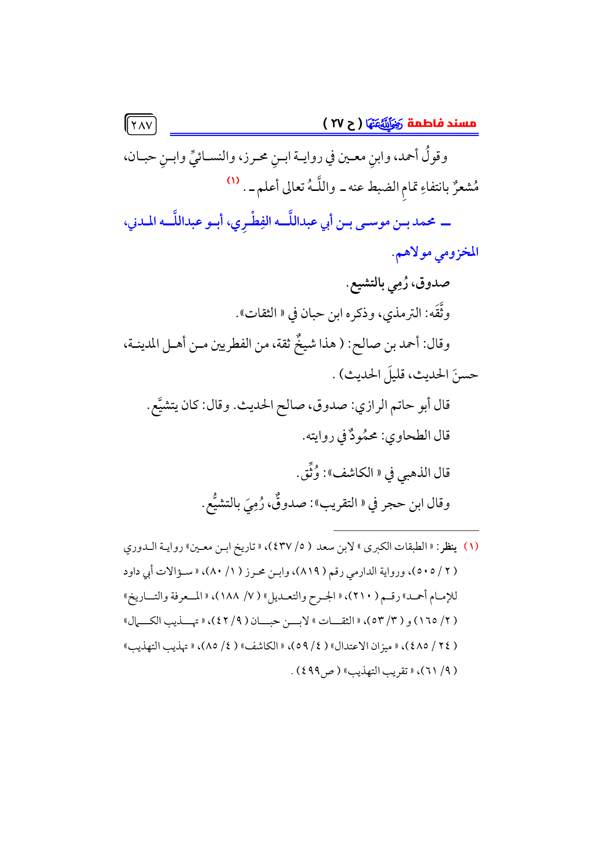 (¬١) ينظر: «الطبقات الكبرى» لابن سعد (٥/ ٤٣٧)، «تاريخ ابن معين» رواية الدوري ... (٢/ ٥٠٥)، ورواية الدارمي رقم (٨١٩)، وابن محرز (١/ ٨٠)، «سؤالات أبي داود للإمام أحمد» رقم (٢١٠)، «الجرح والتعديل» (٧/ ١٨٨)، «المعرفة والتاريخ» ... (٢/ ١٦٥) و (٣/ ٥٣)، «الثقات» لابن حبان (٩/ ٤٢)، «تهذيب الكمال» ... (٢٤/ ٤٨٥)، «ميزان الاعتدال» (٤/ ٥٩)، «الكاشف» (٤/ ٨٥)، «تهذيب التهذيب» (٩/ ٦١)، «تقريب التهذيب» (ص ٤٩٩).