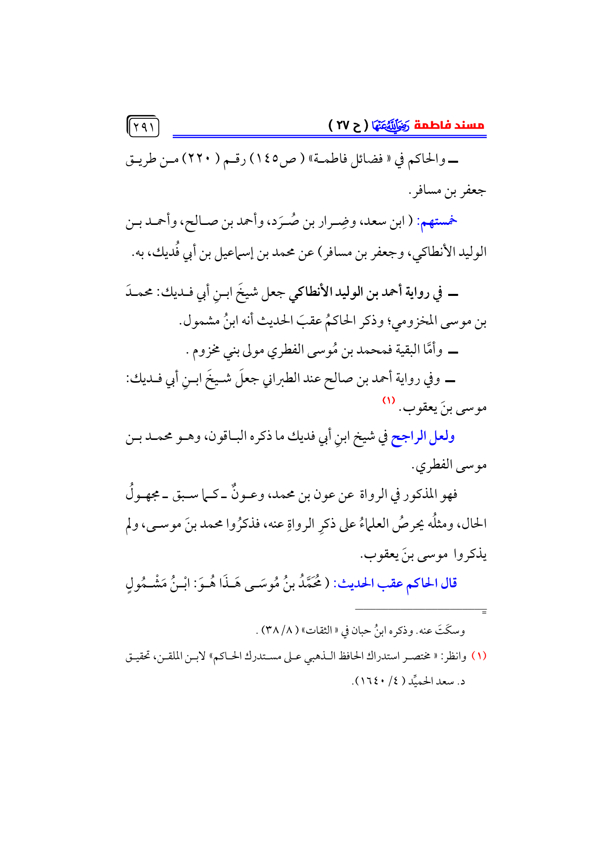 ــ والحاكم في «فضائل فاطمة» (ص ١٤٥) رقم (٢٢٠) من طريق جعفر بن مسافر.