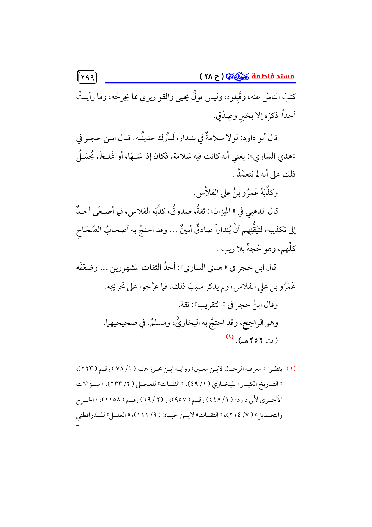 (¬١) ينظر: «معرفة الرجال لابن معين» رواية ابن محرز عنه (١/ ٧٨) رقم (٢٢٣)، ... «التاريخ الكبير» للبخاري (١/ ٤٩)، «الثقات» للعجلي (٢/ ٢٣٣)، «سؤالات الآجري لأبي داود» (١/ ٤٤٨) رقم (٩٥٧)، و (٢/ ٦٩) رقم (١١٥٨)، «الجرح والتعديل» (٧/ ٢١٤)، «الثقات» لابن حبان (٩/ ١١١)، «العلل» للدراقطني ... (١٠/ ٣٨٤)، «تاريخ بغداد» (٢/ ٤٥٨)، «تهذيب الكمال» (٢٤/ ٥١١)، «سير أعلام النبلاء» (١٢/ ١٤٤)، «ميزان الاعتدال» (٤/ ٤١٠)، «تذكرة الحفاظ» (٢/ ٥١١)، ... «الكاشف» (٣/ ٢٣)، «تهذيب التهذيب» (٩/ ٧٠)، «تقريب التهذيب» (ص ٥٠٠)، «هدي الساري» (ص ٤٣٧).