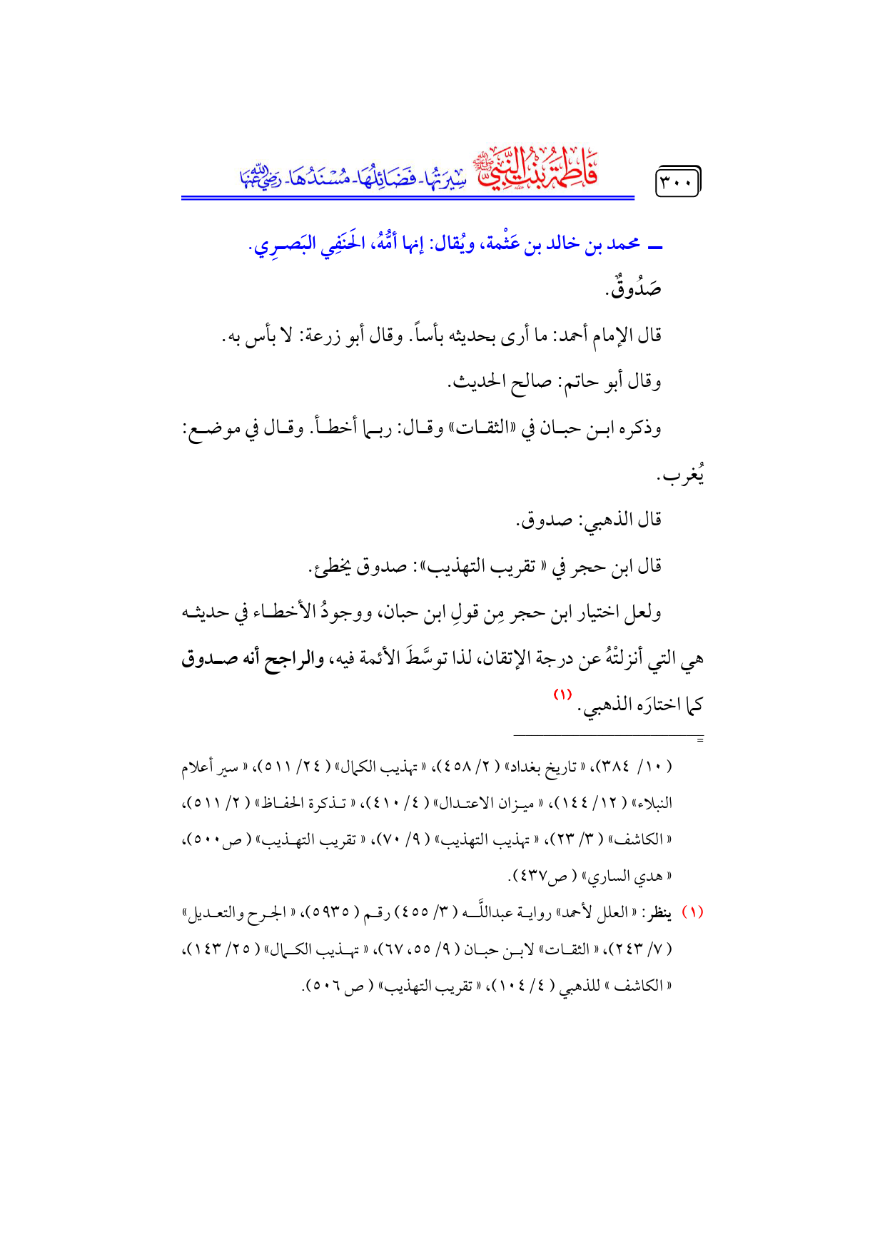 (¬١) ينظر: «العلل لأحمد» رواية عبداللَّه (٣/ ٤٥٥) رقم (٥٩٣٥)، «الجرح والتعديل» ... (٧/ ٢٤٣)، «الثقات» لابن حبان (٩/ ٥٥، ٦٧)، «تهذيب الكمال» (٢٥/ ١٤٣)، ... «الكاشف» للذهبي (٤/ ١٠٤)، «تقريب التهذيب» (ص ٥٠٦).