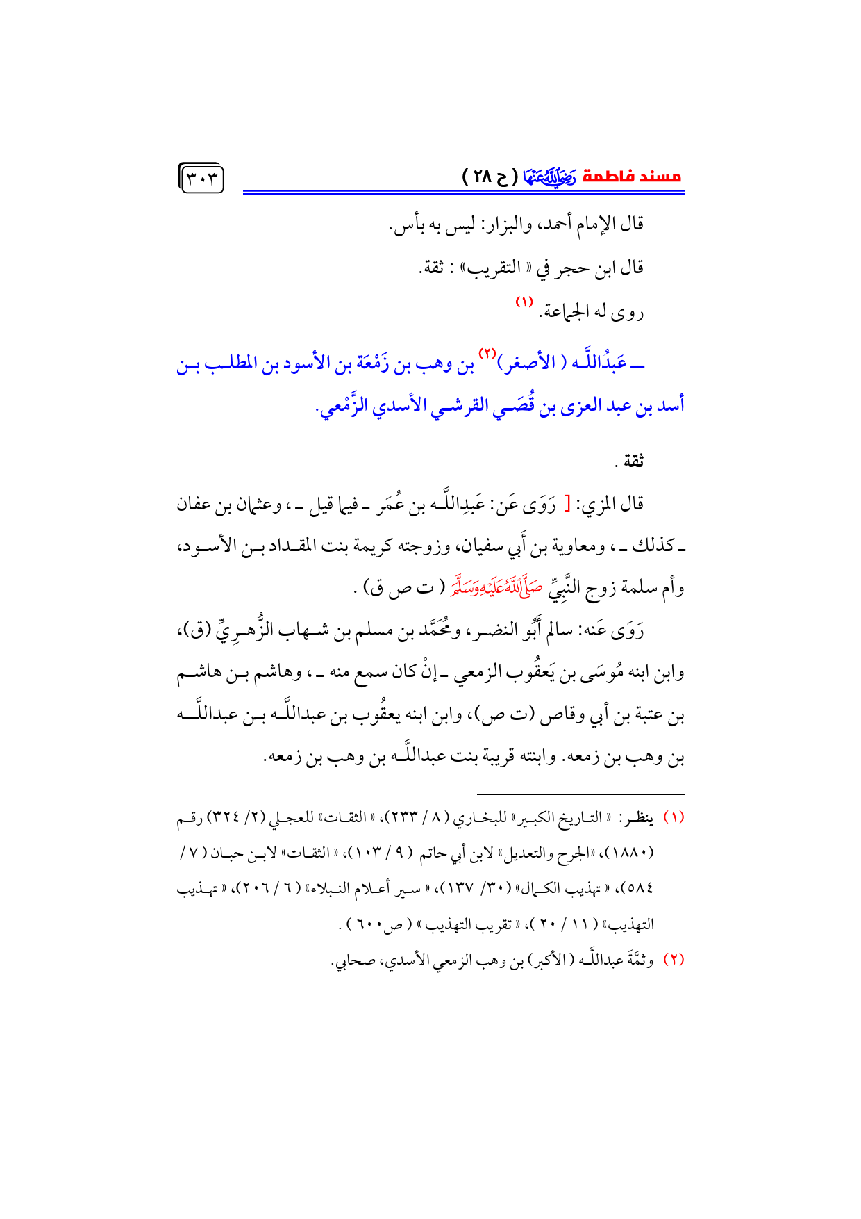 ــ عَبدُاللَّه (الأصغر) (¬٢) بن وهب بن زَمْعَة بن الأسود بن المطلب بن أسد بن عبد العزى بن قُصَي القرشي الأسدي الزَّمْعي.