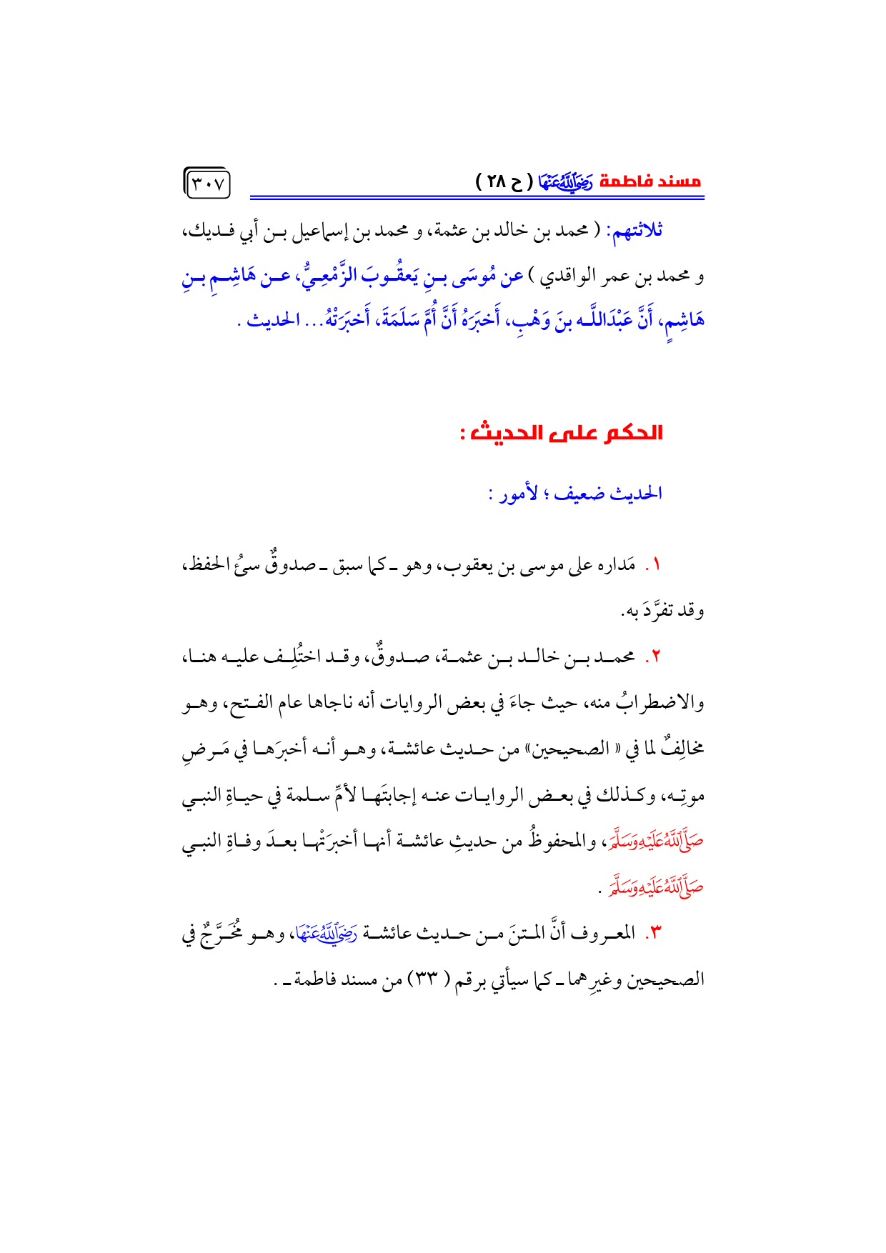 ٢. محمد بن خالد بن عثمة، صدوقٌ، وقد اختُلِف عليه هنا، والاضطرابُ منه، حيث جاءَ في بعض الروايات أنه ناجاها عام الفتح، وهو مخالِفٌ لما في «الصحيحين» من حديث عائشة، وهو أنه أخبرَها في مَرضِ موتِه، وكذلك في بعض الروايات عنه إجابتَها لأمِّ سلمة في حياةِ النبي - صلى الله عليه وسلم -، والمحفوظُ من حديثِ عائشة أنها أخبرَتْها بعدَ وفاةِ النبي - صلى الله عليه وسلم -.