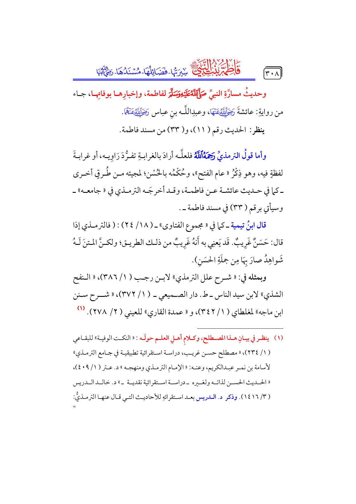 وأما قولُ الترمذيِّ - رحمه الله - فلعلَّه أرادَ بالغرابةِ تفرُّدَ رَاوِيه، أو غرابةَ لفظةٍ فيه، وهو ذِكْرُ «عام الفتح»، وحُكْمُه بالحُسْن؛ لمجيئه من طُرقٍ أخرى ... ـ كما في حديث عائشة عن فاطمة، وقد أخرجَه الترمذي في «جامعه» ـ وسيأتي برقم (٣٣) في مسند فاطمة ـ.