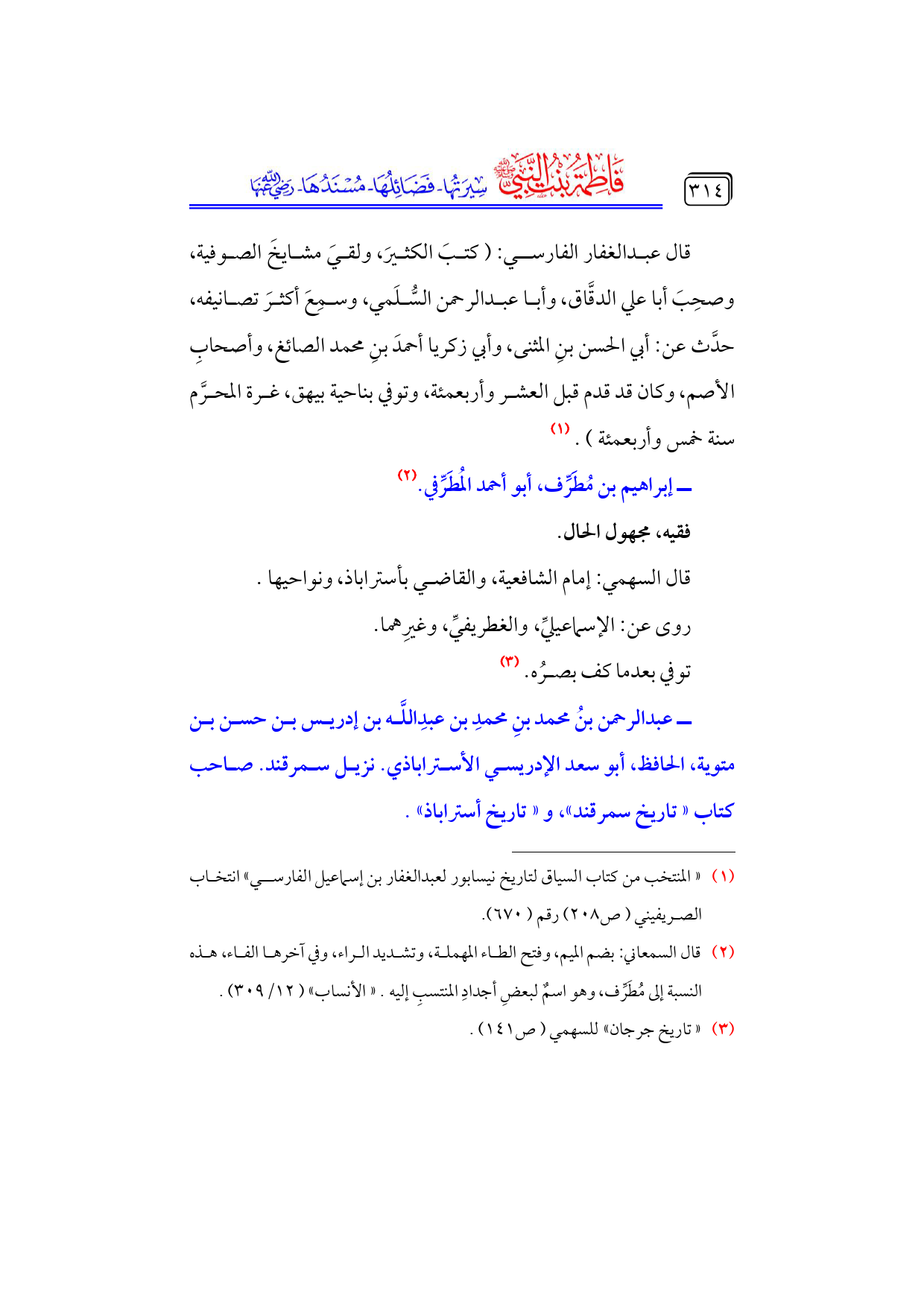(¬٢) قال السمعاني: بضم الميم، وفتح الطاء المهملة، وتشديد الراء، وفي آخرها الفاء، هذه النسبة إلى مُطَرِّف، وهو اسمٌ لبعضِ أجدادِ المنتسبِ إليه. «الأنساب» (١٢/ ٣٠٩).