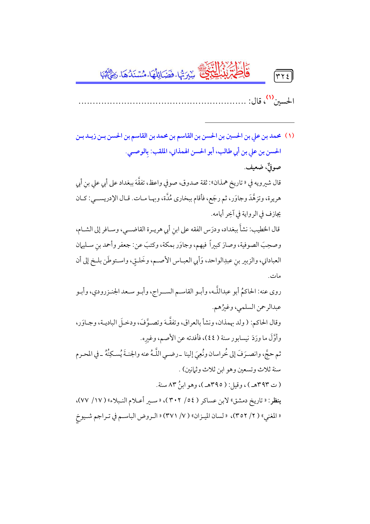 (¬١) محمد بن علي بن الحسين بن الحسن بن القاسم بن محمد بن القاسم بن الحسن بن زيد بن الحسن بن علي بن أبي طالب، أبو الحسن الهمذاني، الملقب: بِالوصي.