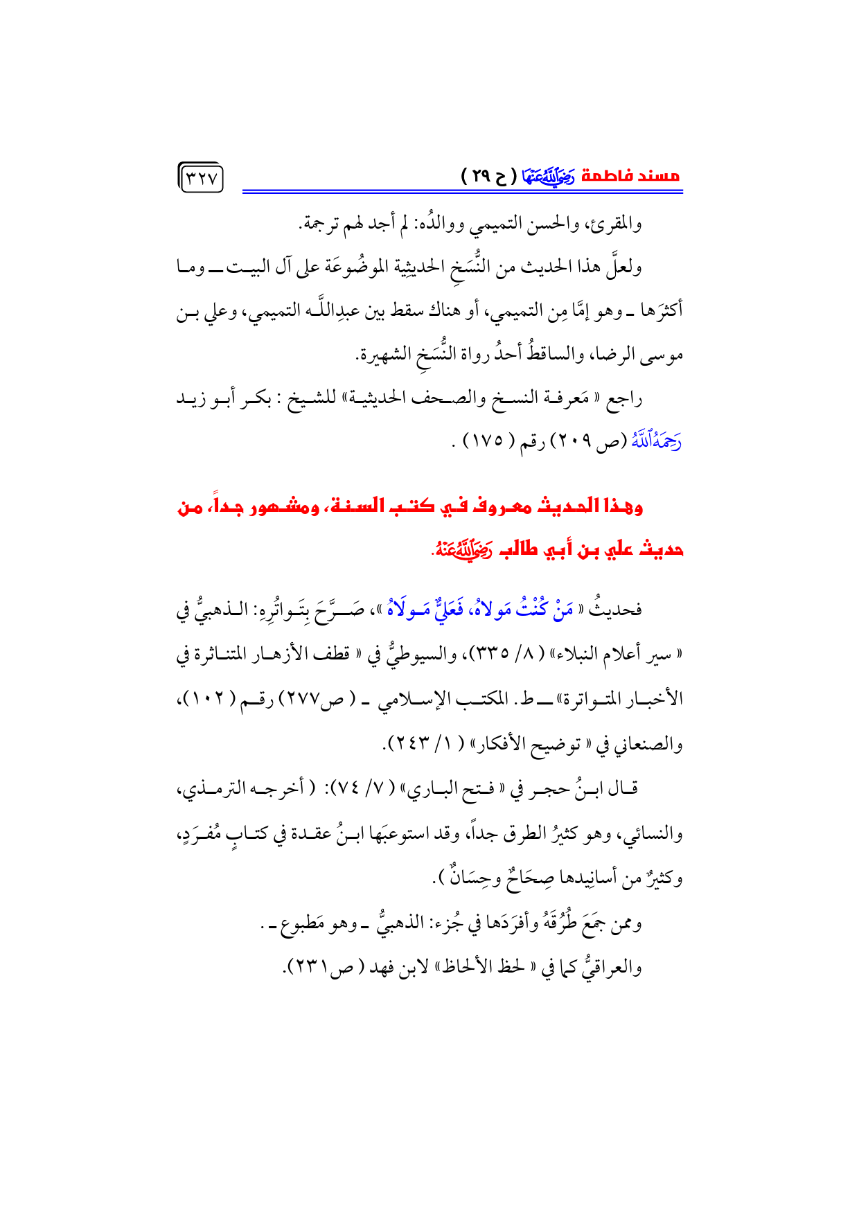 فحديثُ «مَنْ كُنْتُ مَولاهُ، فَعَليٌّ مَولَاهُ»، صَرَّحَ بِتَواتُرِهِ: الذهبيُّ في ... «سير أعلام النبلاء» (٨/ ٣٣٥)، والسيوطيُّ في «قطف الأزهار المتناثرة في الأخبار المتواترة» ـ ط. المكتب الإسلامي ـ (ص ٢٧٧) رقم (١٠٢)، والصنعاني في «توضيح الأفكار» (١/ ٢٤٣).