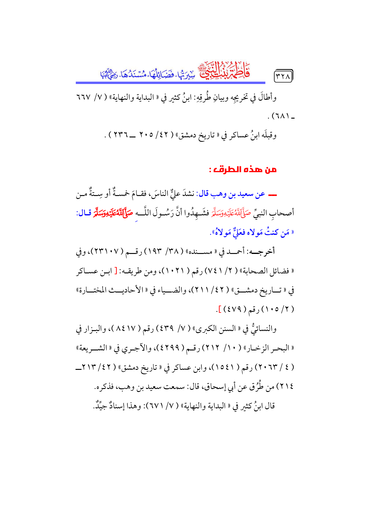 ــ عن سعيد بن وهب قال: نشدَ عليٌّ الناسَ، فقامَ خمسةٌ أو سِتةٌ من أصحابِ النبيِّ - صلى الله عليه وسلم - فشَهِدُوا أنَّ رَسُولَ اللَّهِ - صلى الله عليه وسلم - قال: ... «مَن كنتُ مَولاه فعَليٌّ مَولاهُ».