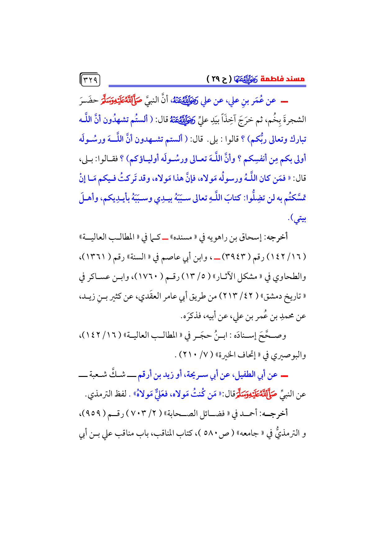 ــ عن عُمَر بنِ علي، عن علي - رضي الله عنه -، أنَّ النبيَّ - صلى الله عليه وسلم - حضَرَ الشجرةَ بِخُم، ثم خرَجَ آخِذَاً بيَدِ عليِّ - رضي الله عنه - قال: (ألستُم تشهدُون أنَّ اللَّه تبارك وتعالى ربُّكم)؟ قالوا: بلى. قال: (ألستم تشهدون أنَّ اللَّهَ ورسُولَه أولى بكم مِن أنفسِكم؟ وأنَّ اللَّهَ تعالى ورسُولَه أولياؤكم)؟ فقالوا: بلى، قال: «فمَن كان اللَّهُ ورسولُه مَولاه، فإنَّ هذا مَولاه، وقد تَركتُ فيكم مَا إنْ تمسَّكتُم به لن تضِلُّوا: كتابَ اللَّهِ تعالى سبَبَهُ بيدِي وسبَبَهُ بأيدِيكم، وأهلَ بيتي).
