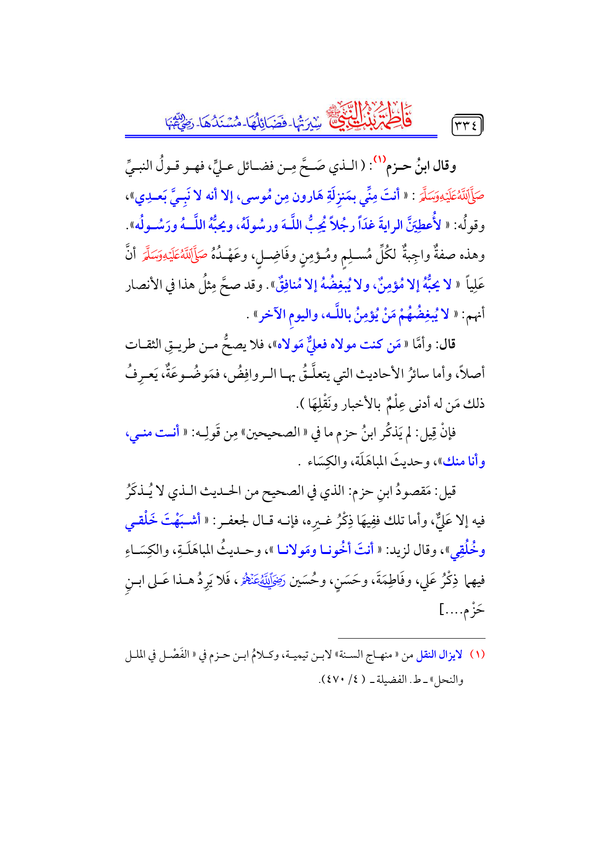 قيل: مَقصودُ ابنِ حزم: الذي في الصحيح من الحديث الذي لا يُذكَرُ فيه إلا عَليٌّ، وأما تلك ففِيهَا ذِكْرُ غيرِه، فإنه قال لجعفر: «أشبَهْتَ خَلْقي وخُلُقِي»، وقال لزيد: «أنتَ أخُونا ومَولانا»، وحديثُ المباهَلَةِ، والكِسَاءِ فيهما ذِكْرُ عَلي، وفَاطِمَةَ، وحَسَنٍ، وحُسَين - رضي الله عنهم -، فَلا يَرِدُ هذا عَلى ابنِ حَزْم .... ]