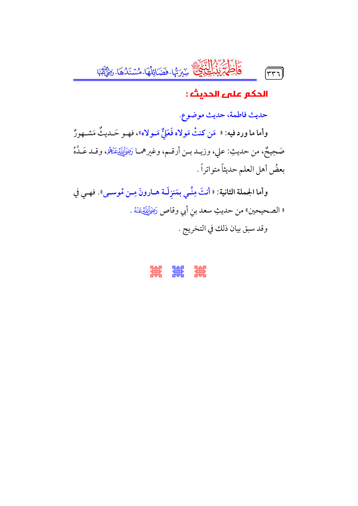 كتاب فاطمة بنت النبي - صلى الله عليه وسلم - سيرتها، فضائلها، مسندها - رضي الله عنها - (اسم الجزء: 6)