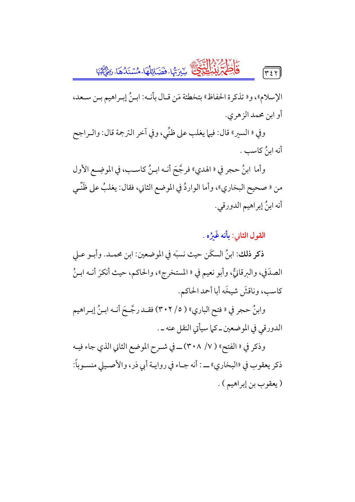 وأما ابنُ حجر في «الهدي» فرجَّحَ أنه ابنُ كاسب، في الموضِع الأول من «صحيح البخاري»، وأما الواردُ في الموضع الثاني، فقال: يغلبُ على ظَنِّي أنه ابنُ إبراهيم الدورقي.