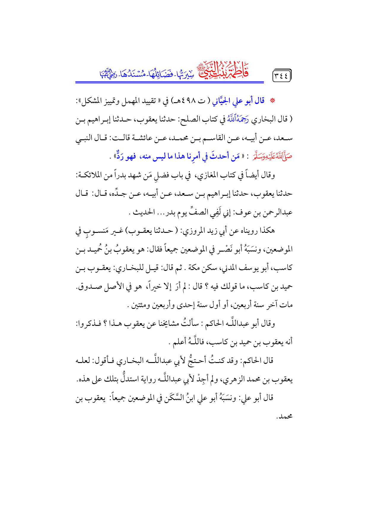 * قال أبو علي الجيَّاني (ت ٤٩٨ هـ) في «تقييد المهمل وتمييز المشكل»: (قال البخاري - رحمه الله - في كتاب الصلح: حدثنا يعقوب، حدثنا إبراهيم بن سعد، عن أبيه، عن القاسم بن محمد، عن عائشة قالت: قال النبي - صلى الله عليه وسلم -: «مَن أحدثَ في أمرِنا هذا ما ليس منه، فهو رَدٌّ».