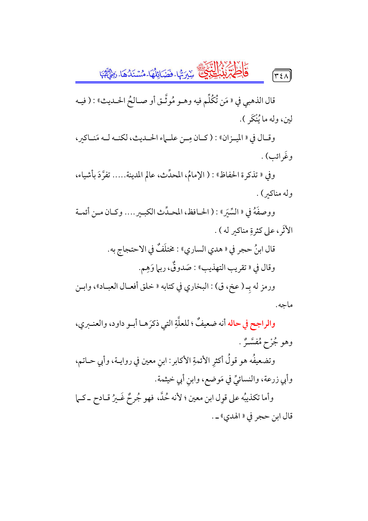 وتضعيفُه هو قولُ أكثرِ الأئمةِ الأكابر: ابنِ معين في رواية، وأبي حاتم، وأبي زرعة، والنسائيِّ في مَوضع، وابنِ أبي خيثمة.