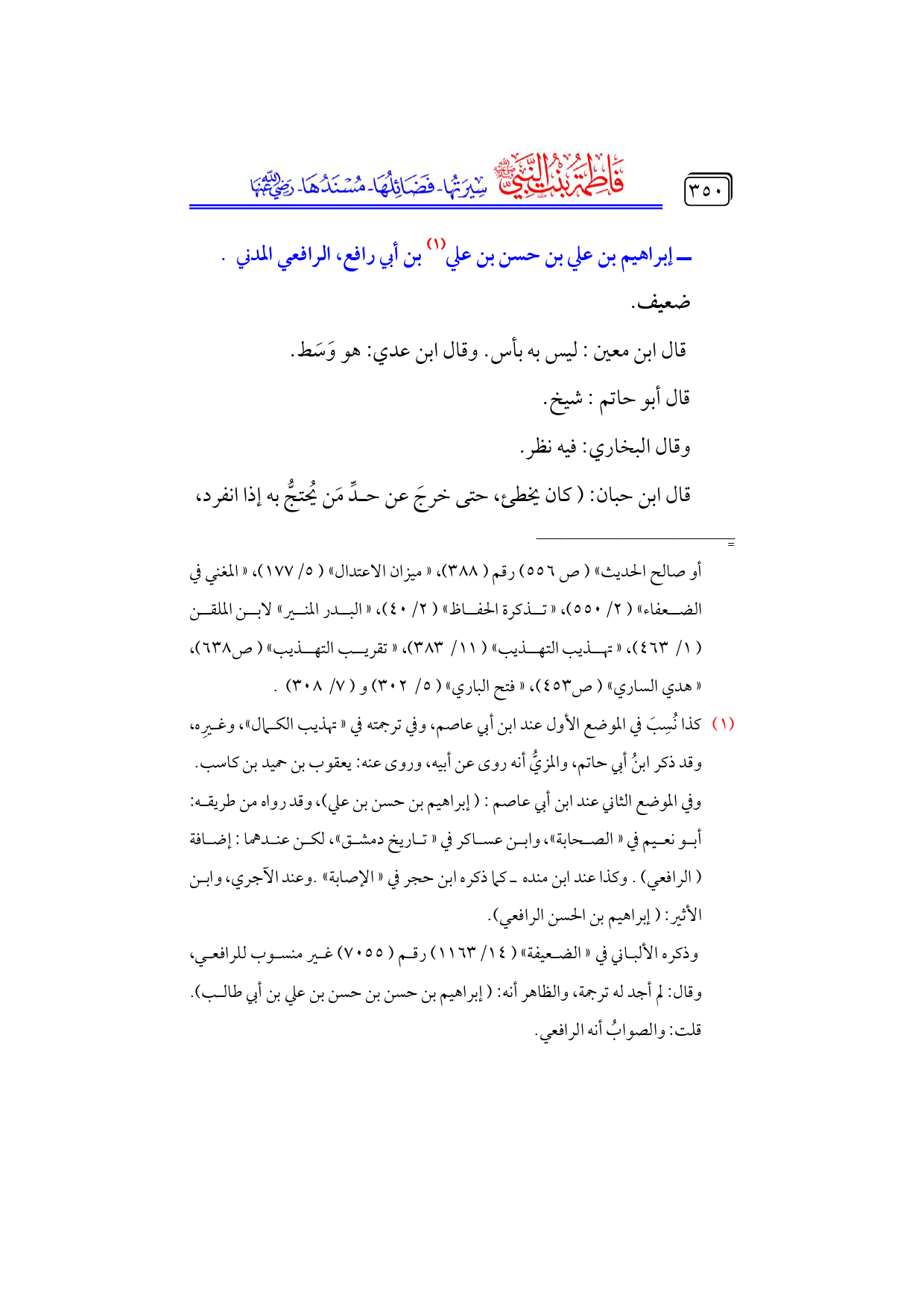 وفي الموضع الثاني عند ابن أبي عاصم: (إبراهيم بن حسن بن علي)، وقد رواه من طريقه: أبو نعيم في «الصحابة»، وابن عساكر في «تاريخ دمشق»، لكن عندهما: إضافة ... (الرافعي). وكذا عند ابن منده ـ كما ذكره ابن حجر في «الإصابة».وعند الآجري، وابن الأثير: (إبراهيم بن الحسن الرافعي).