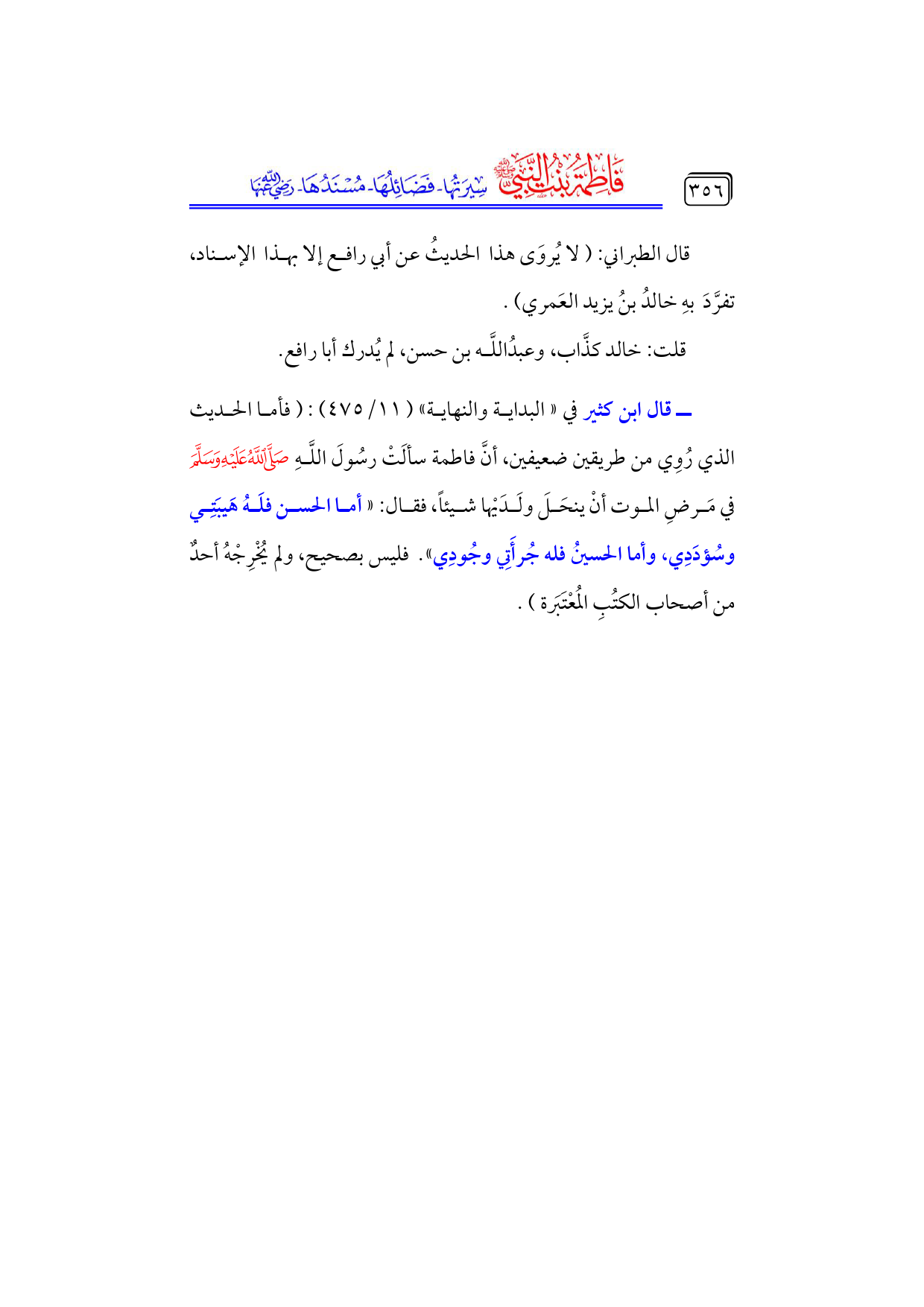 ــ قال ابن كثير في «البداية والنهاية» (١١/ ٤٧٥): (فأما الحديث الذي رُوِي من طريقين ضعيفين، أنَّ فاطمة سألَتْ رسُولَ اللَّهِ - صلى الله عليه وسلم - في مَرضِ الموت أنْ ينحَلَ ولَدَيْها شيئاً، فقال: «أما الحسن فلَهُ هَيبَتِي وسُؤدَدِي، وأما الحسينُ فله جُرأَتِي وجُودِي». فليس بصحيح، ولم يُخْرِجْهُ أحدٌ من أصحاب الكتُبِ المُعْتَبَرة).