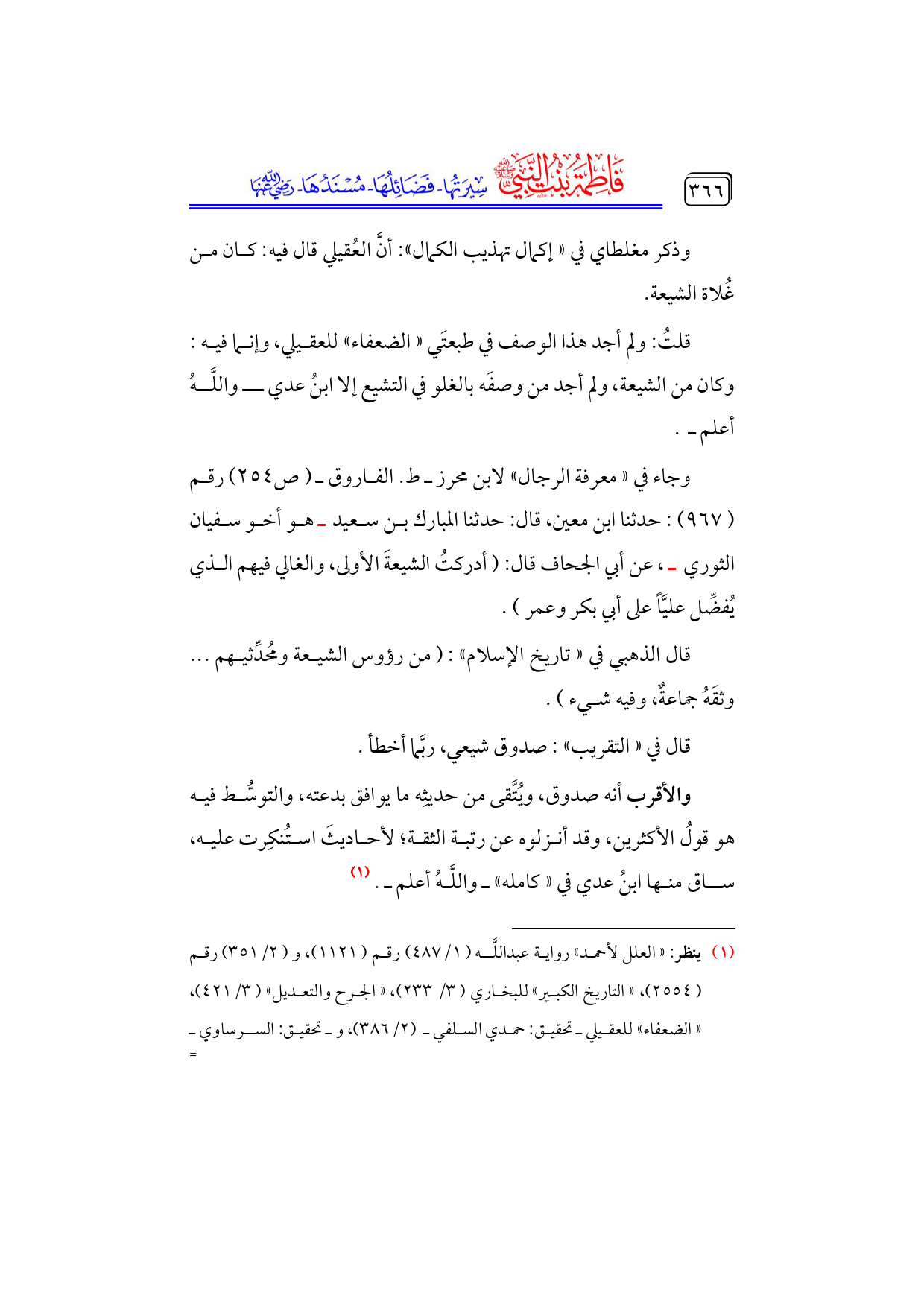 قلتُ: ولم أجد هذا الوصف في طبعتَي «الضعفاء» للعقيلي، وإنما فيه: وكان من الشيعة، ولم أجد من وصفَه بالغلو في التشيع إلا ابنُ عدي ــ واللَّهُ أعلم ـ.