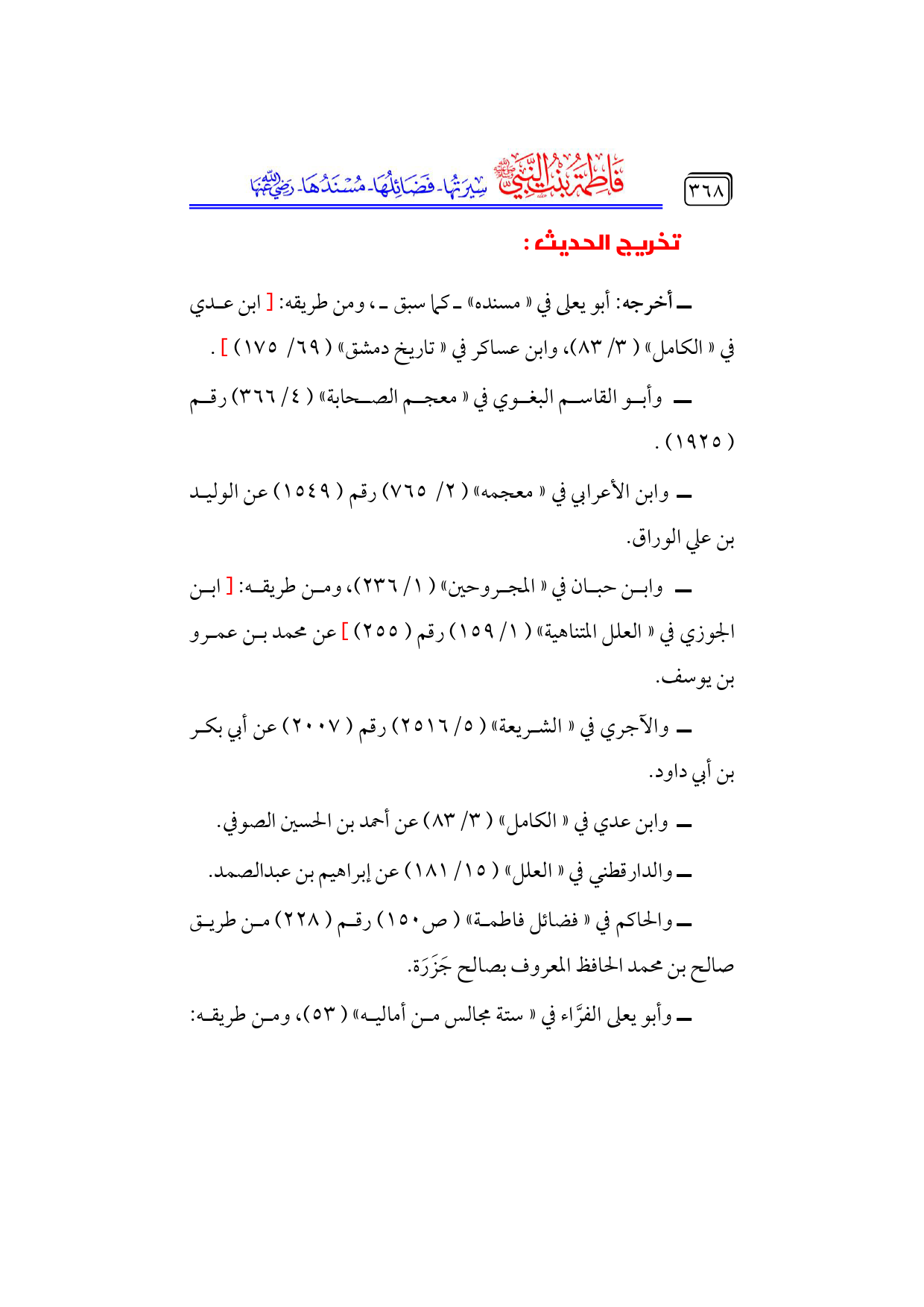 كتاب فاطمة بنت النبي - صلى الله عليه وسلم - سيرتها، فضائلها، مسندها - رضي الله عنها - (اسم الجزء: 6)