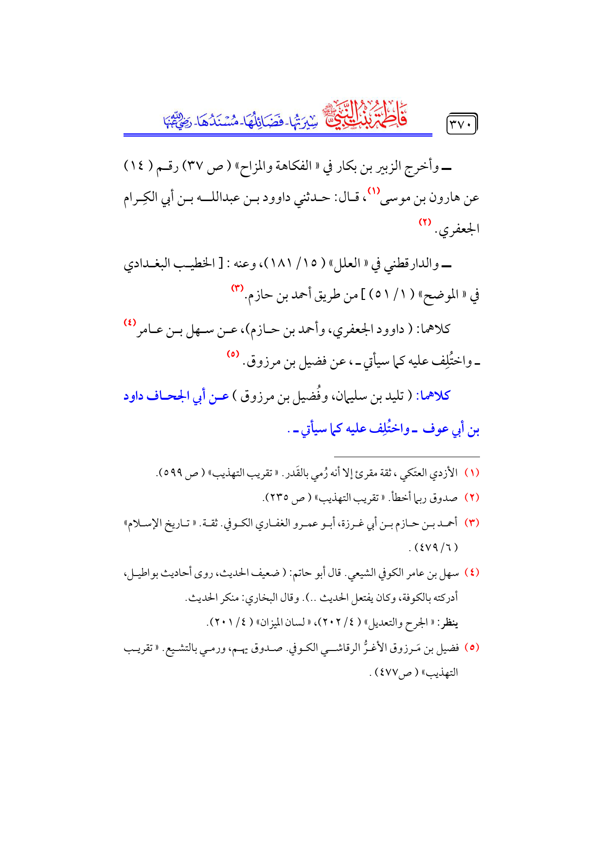 ــ وأخرج الزبير بن بكار في «الفكاهة والمزاح» (ص ٣٧) رقم (١٤) عن هارون بن موسى (¬١)، قال: حدثني داوود بن عبدالله بن أبي الكِرام الجعفري. (¬٢)