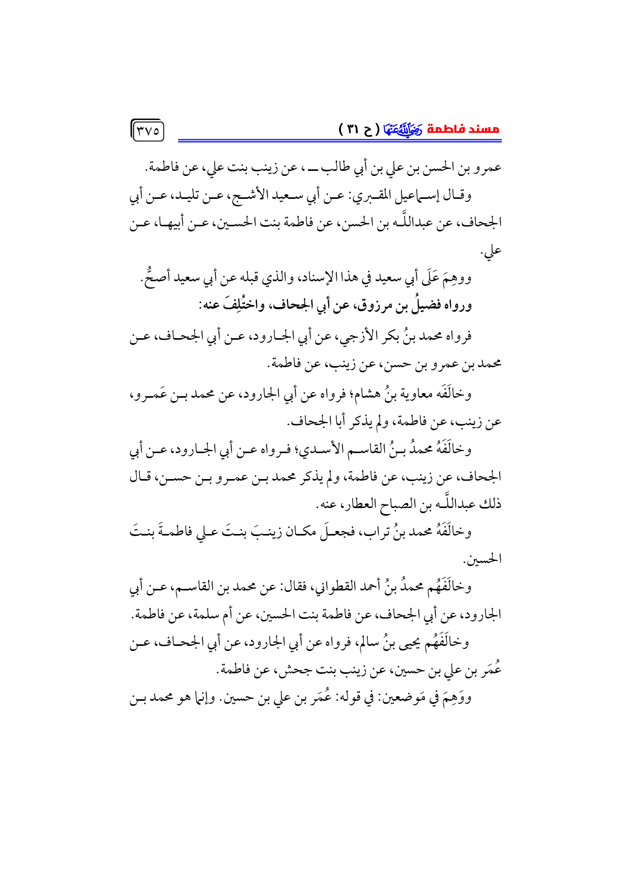 وخالَفَهُ محمدُ بنُ القاسم الأسدي؛ فرواه عن أبي الجارود، عن أبي الجحاف، عن زينب، عن فاطمة، ولم يذكر محمد بن عمرو بن حسن، قال ذلك عبداللَّه بن الصباح العطار، عنه.