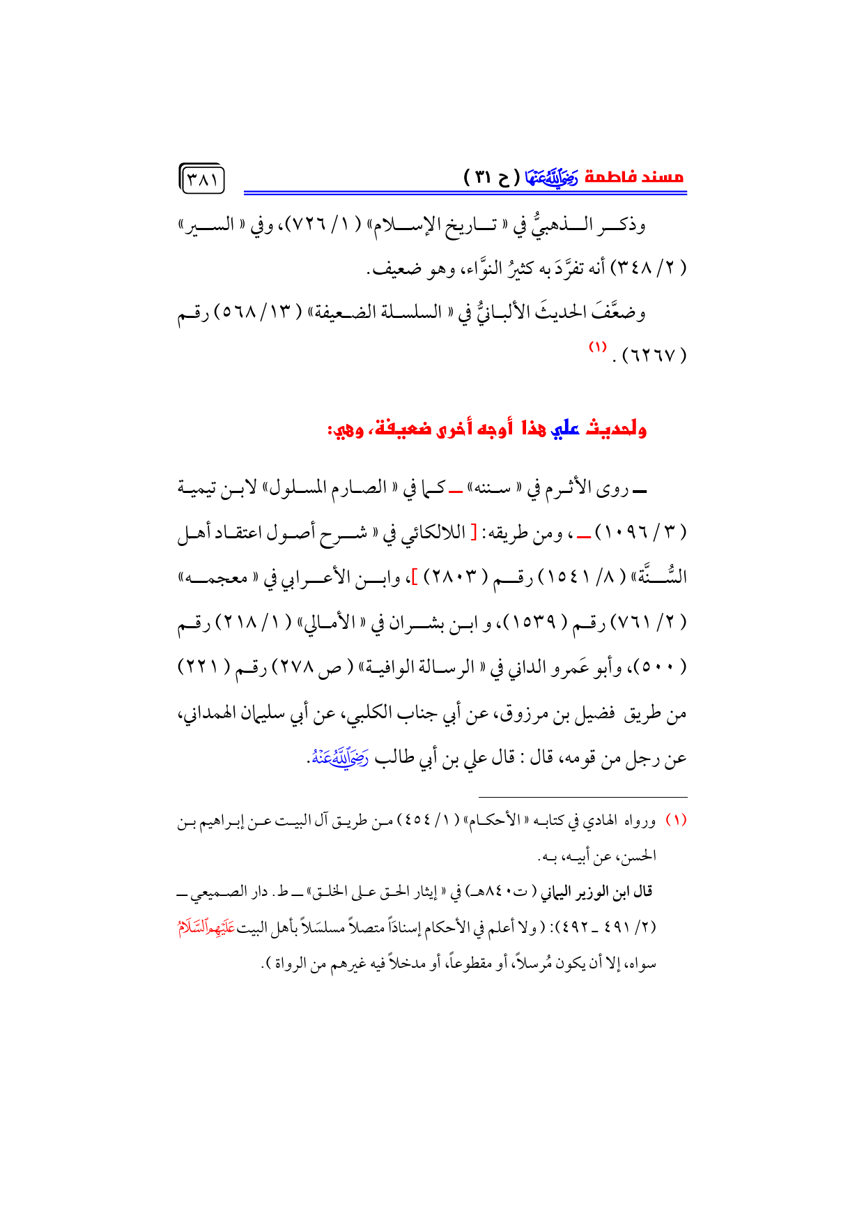 قال ابن الوزير اليماني (ت ٨٤٠ هـ) في «إيثار الحق على الخلق» ـ ط. دار الصميعي ـ ... (٢/ ٤٩١ ـ ٤٩٢): (ولا أعلم في الأحكام إسنادَاً متصلاً مسلسَلاً بأهل البيت - عليهم السلام - سواه، إلا أن يكون مُرسلاً، أو مقطوعاً، أو مدخلاً فيه غيرهم من الرواة).