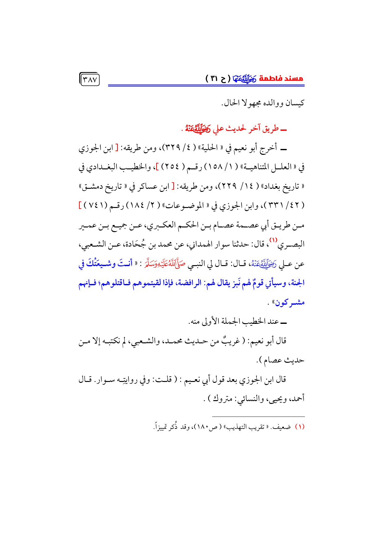 ــ أخرج أبو نعيم في «الحلية» (٤/ ٣٢٩)، ومن طريقه: [ابن الجوزي في «العلل المتناهية» (١/ ١٥٨) رقم (٢٥٤)]، والخطيب البغدادي في ... «تاريخ بغداد» (١٤/ ٢٢٩)، ومن طريقه: [ابن عساكر في «تاريخ دمشق» (٤٢/ ٣٣١)، وابن الجوزي في «الموضوعات» (٢/ ١٨٤) رقم (٧٤١)] من طريق أبي عصمة عصام بن الحكم العكبري، عن جميع بن عمير البصري (¬١)، قال: حدثنا سوار الهمداني، عن محمد بن جُحَادة، عن الشعبي، عن علي - رضي الله عنه -، قال: قال لي النبي - صلى الله عليه وسلم -: «أنتَ وشيعَتُكَ في الجنة، وسيأتي قومٌ لهم نَبز يقال لهم: الرافضة، فإذا لقيتموهم فاقتلوهم؛ فإنهم مشركون».